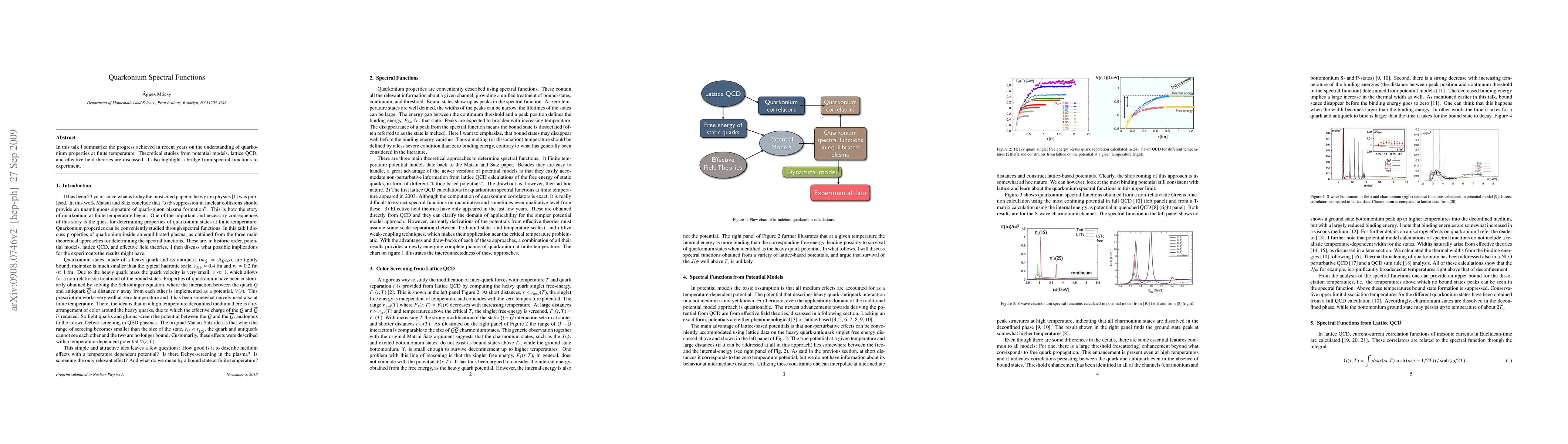 This talk summarizes advancements in understanding quarkonium properties at finite temperatures through potential models, lattice QCD, and effective field theories. It also establishes a connection between theoretical spectral functions and experimental data.
