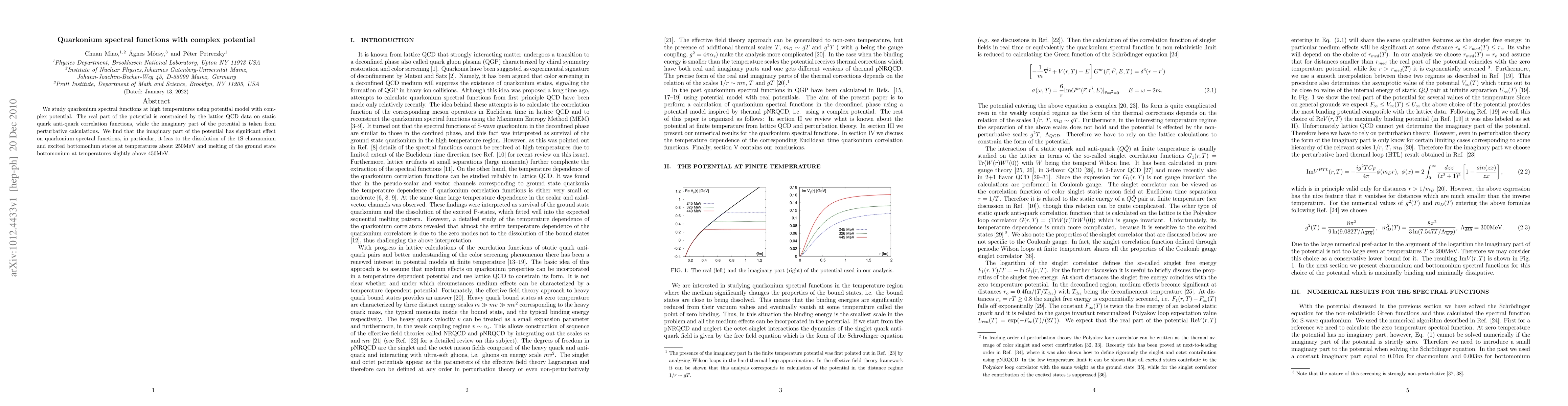 We study quarkonium spectral functions at high temperatures using potential model with complex potential. The real part of the potential is constrained by the lattice QCD data on static quark anti-quark correlation functions, while the imaginary part of the potential is taken from perturbative calculations. We find that the imaginary part of the potential has significant effect on quarkonium spectral functions, in particular, it leas to the dissolution of the 1S charmonium and excited bottomonium states at temperatures about 250 MeV and melting of the ground state bottomonium at temperatures slightly above 450 MeV.