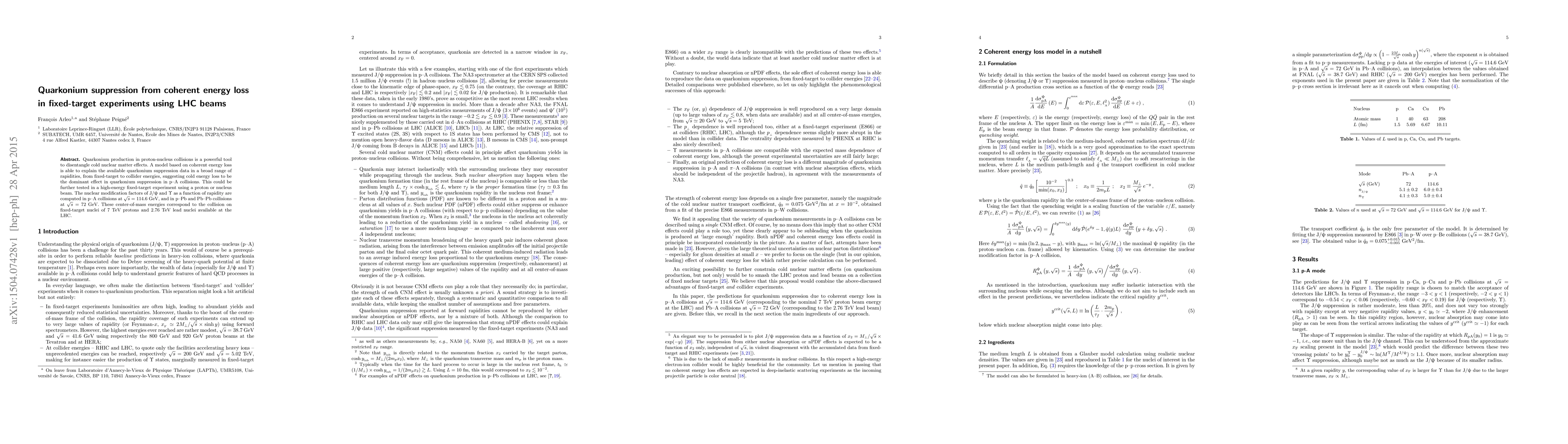 Quarkonium production in proton-nucleus collisions is a powerful tool to disentangle cold nuclear matter effects. A model based on coherent energy loss is able to explain the available quarkonium suppression data in a broad range of rapidities, from fixed-target to collider energies, suggesting cold energy loss to be the dominant effect in quarkonium suppression in p-A collisions. This could be further tested in a high-energy fixed-target experiment using a proton or nucleus beam. The nuclear modification factors of J/$\psi$ and $\Upsilon$ as a function of rapidity are computed in p-A collisions at $\sqrt{s}=114.6$ GeV, and in p-Pb and Pb-Pb collisions at $\sqrt{s}=72$ GeV. These center-of-mass energies correspond to the collision on fixed-target nuclei of 7 TeV protons and 2.76 TeV lead nuclei available at the LHC.
