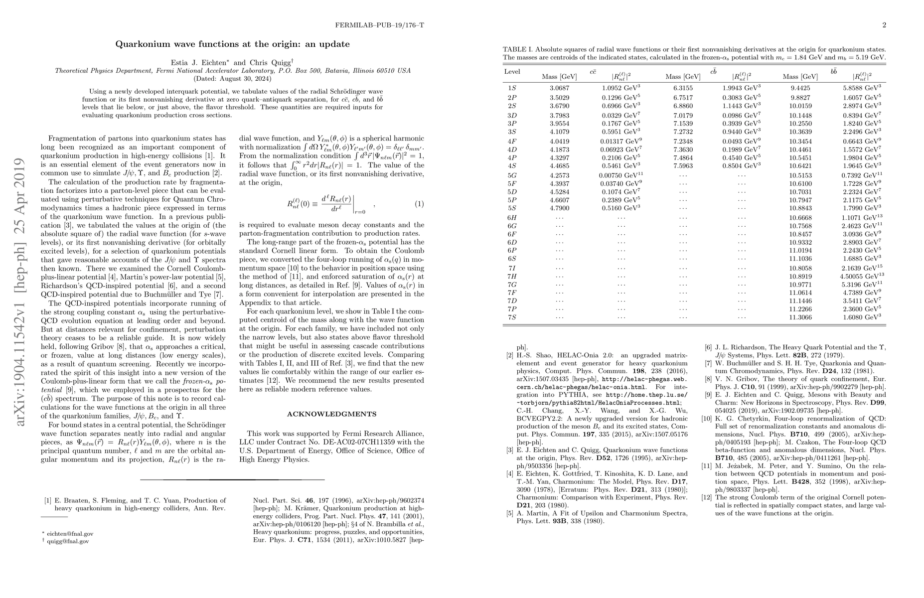Using a newly developed interquark potential, we tabulate values of the radial Schr\"{o}dinger wave function or its first nonvanishing derivative at zero quark--antiquark separation, for $c\bar{c}$, $c\bar{b}$, and $b\bar{b}$ levels that lie below, or just above, the flavor threshold. These quantities are required inputs for evaluating quarkonium production cross sections.