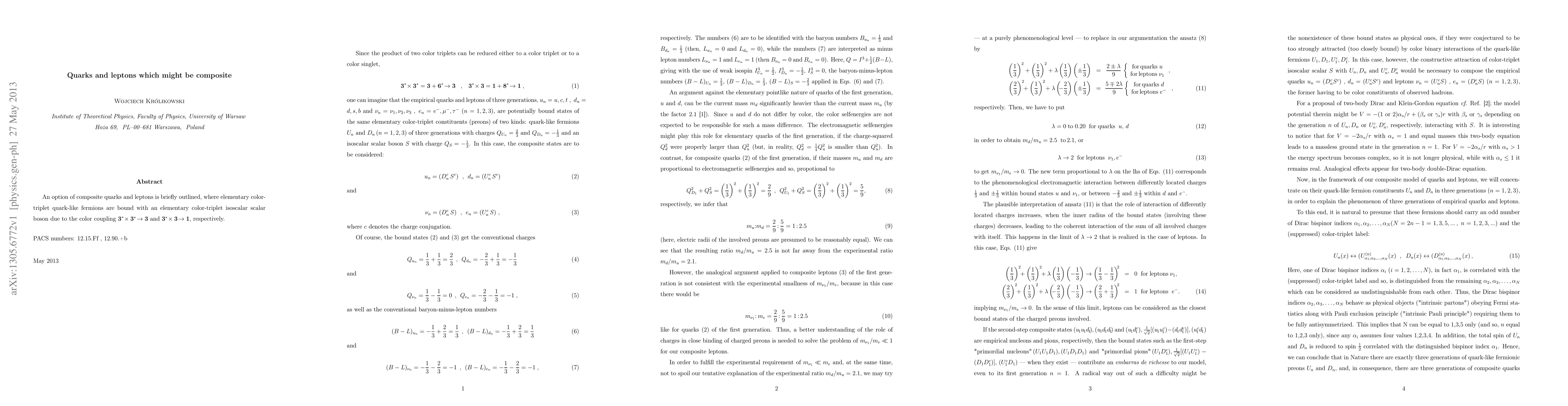 An option of composite quarks and leptons is briefly outlined, where elementary color-triplet quark-like fermions are bound with an elementary color-triplet isoscalar scalar boson due to the color coupling 3* x 3* -> 3 and 3* x 3 -> 1, respectively.