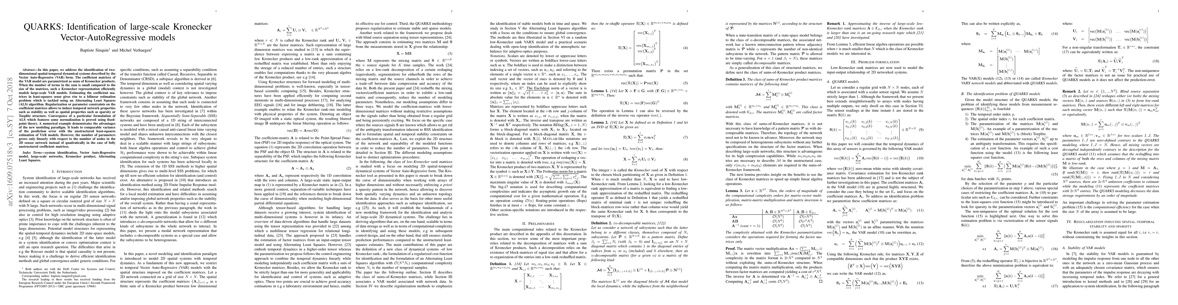 In this paper we propose a Kronecker-based modeling for identifying the spatial-temporal dynamics of large sensor arrays. The class of Kronecker networks is defined for which we formulate a Vector Autoregressive model. Its coefficient-matrices are decomposed into a sum of Kronecker products. For a two-dimensional array of size $N \times N$, and when the number of terms in the sum is small compared to $N$, exploiting the Kronecker structure leads to high data compression. We propose an Alternating Least Squares algorithm to identify the coefficient matrices with $\mathcal{O}(N^3N_t)$, where $N_t$ is the number of temporal samples, instead of $\mathcal{O}(N^6)$ in the unstructured case. This framework moreover allows for a convenient integration of more structure (e.g sparse, banded, Toeplitz) on the factor matrices. Numerical examples on atmospheric turbulence data has shown comparable performances with the unstructured least-squares estimation while the number of parameters is growing only linearly w.r.t. the number of nodes instead of quadratically in the full unstructured matrix case.