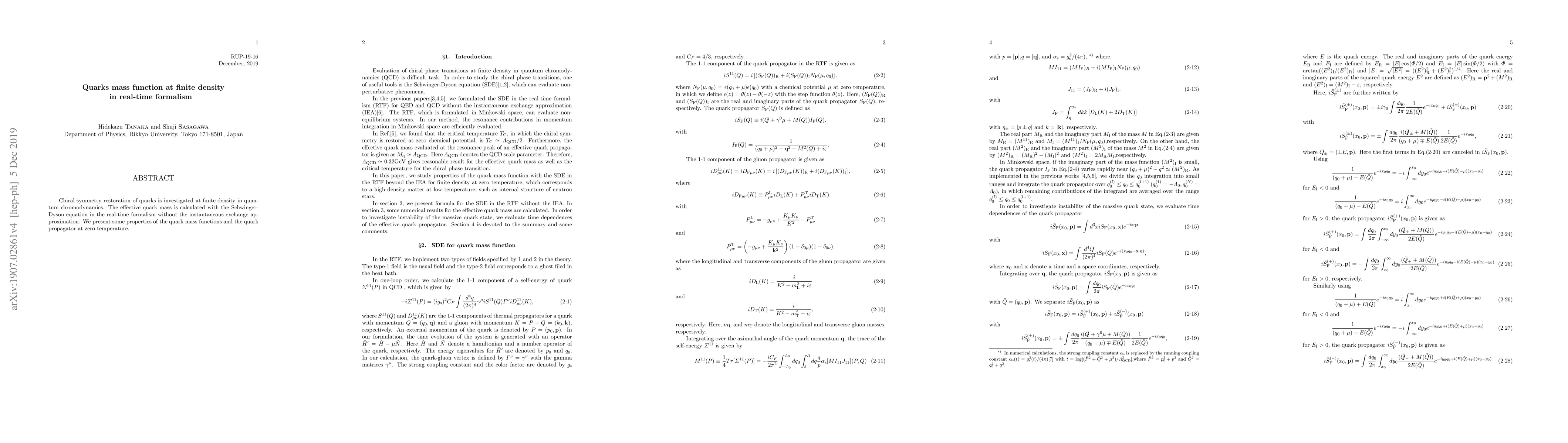 This paper investigates chiral symmetry restoration in quarks at finite density using quantum chromodynamics and the real-time formalism. The effective quark mass is computed via the Schwinger-Dyson equation, revealing properties of quark mass functions and propagators at zero temperature.