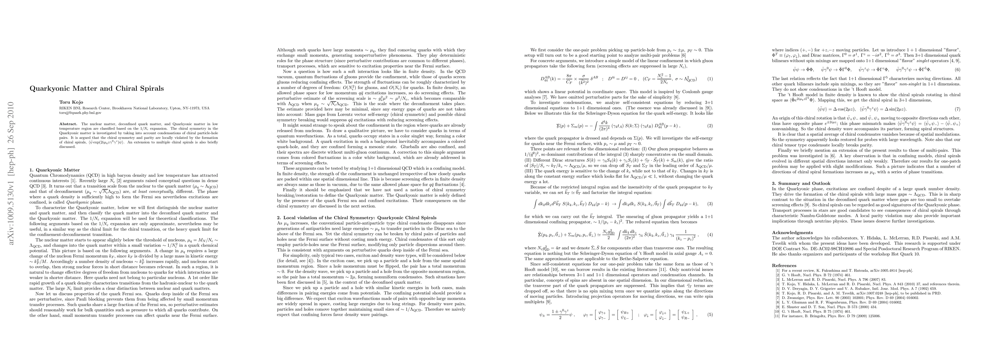 The nuclear matter, deconfined quark matter, and Quarkyonic matter in low temperature region are classified based on the 1/Nc expansion. The chiral symmetry in the Quarkyonic matter is investigated by taking into account condensations of chiral particle-hole pairs. It is argued that the chiral symmetry and parity are locally violated by the formation of chiral spirals, < psibar exp(2 i mu z gamma^0 gamma^z) psi >. An extension to multiple chiral spirals is also briefly discussed.