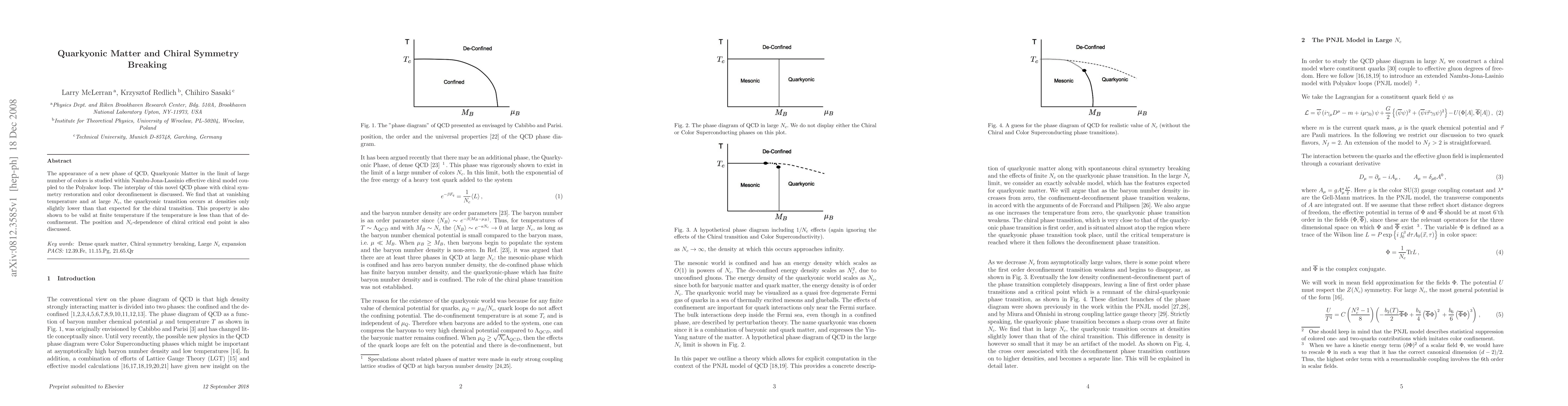 The appearance of a new phase of QCD, Quarkyonic Matter in the limit of large number of colors is studied within Nambu-Jona-Lassinio effective chiral model coupled to the Polyakov loop. The interplay of this novel QCD phase with chiral symmetry restoration and color deconfinement is discussed. We find that at vanishing temperature and at large $N_c$, the quarkyonic transition occurs at densities only slightly lower than that expected for the chiral transition. This property is also shown to be valid at finite temperature if the temperature is less than that of deconfinement. The position and $N_c$-dependence of chiral critical end point is also discussed.