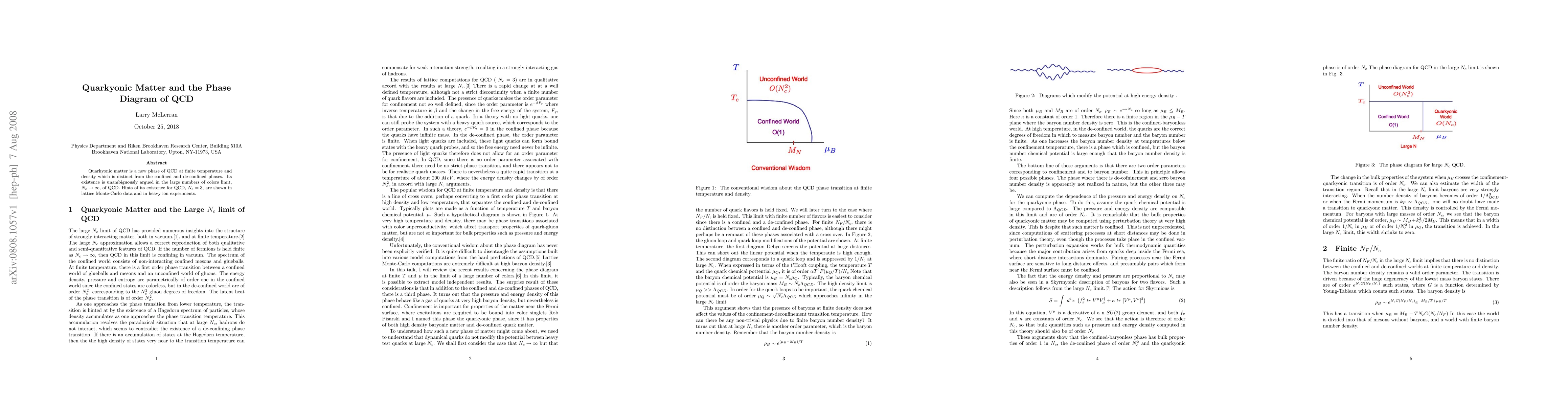 Summary: This paper explores quarkyonic matter, a novel phase of Quantum Chromodynamics (QCD) at finite temperature and density, distinct from confined and de-confined phases. Evidence for its existence in 3 color QCD is suggested by lattice Monte-Carlo data and heavy ion experiments.