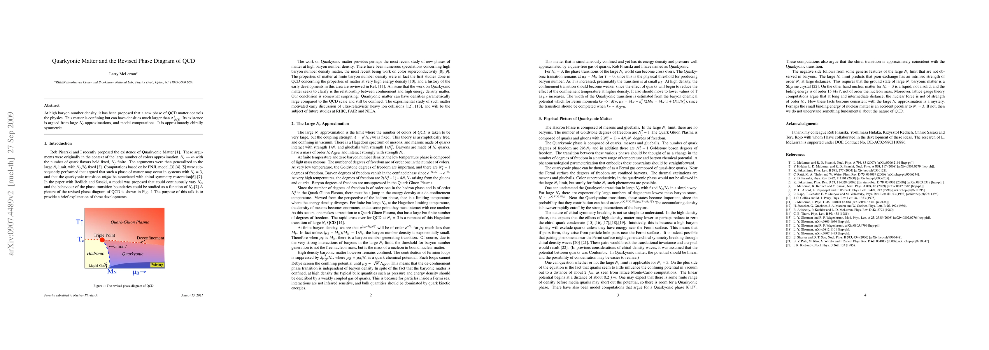 Summary: This paper proposes the existence of quarkyonic matter, a new phase of Quantum Chromodynamics (QCD) at high baryon density, which is both confining and chirally symmetric, challenging the conventional phase diagram of QCD. The concept is supported by large Nc approximations and model computations.