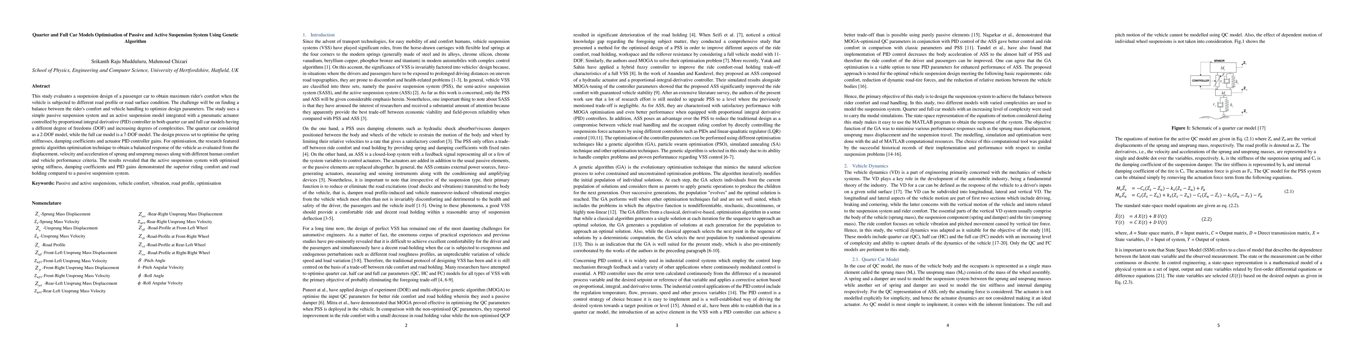 This study optimizes passive and active suspension systems in quarter and full car models using genetic algorithms to balance rider comfort and vehicle handling. Results show that the active suspension with optimized parameters provides superior comfort and road holding compared to the passive system.