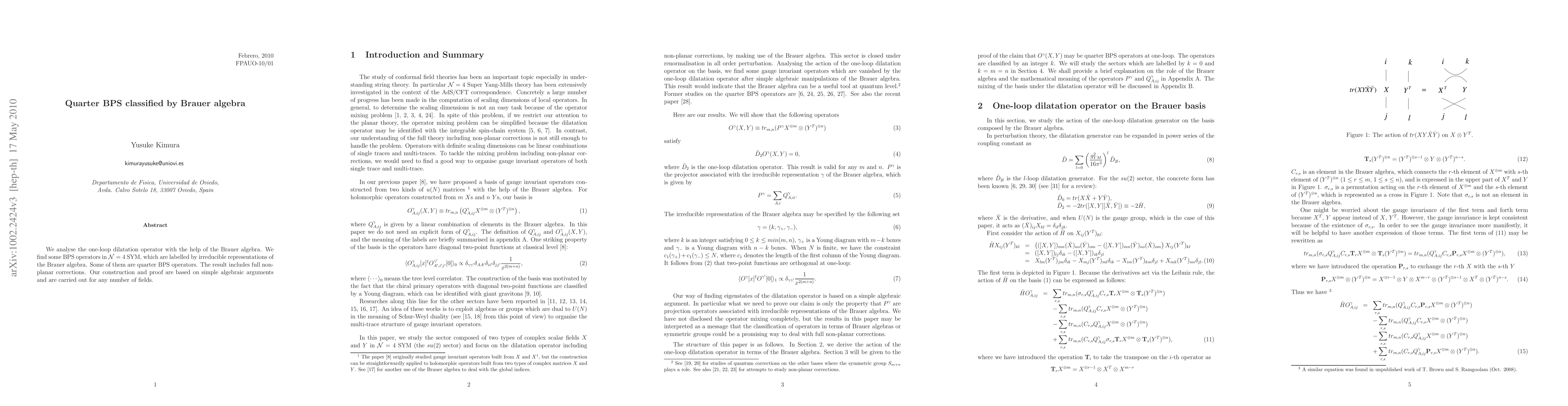 We analyse the one-loop dilatation operator with the help of the Brauer algebra. We find some BPS operators in N=4 SYM, which are labelled by irreducible representations of the Brauer algebra. Some of them are quarter BPS operators. The result includes full non-planar corrections. Our construction and proof are based on simple algebraic arguments and are carried out for any number of fields.