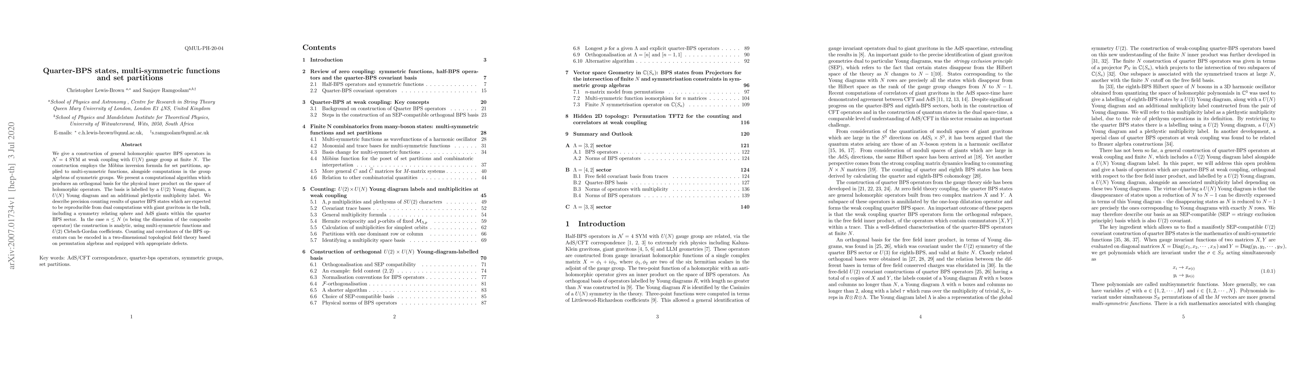 We give a construction of general holomorphic quarter BPS operators in $ \mathcal{N}=4$ SYM at weak coupling with $U(N)$ gauge group at finite $N$. The construction employs the M\"obius inversion formula for set partitions, applied to multi-symmetric functions, alongside computations in the group algebras of symmetric groups. We present a computational algorithm which produces an orthogonal basis for the physical inner product on the space of holomorphic operators. The basis is labelled by a $U(2)$ Young diagram, a $U(N)$ Young diagram and an additional plethystic multiplicity label. We describe precision counting results of quarter BPS states which are expected to be reproducible from dual computations with giant gravitons in the bulk, including a symmetry relating sphere and AdS giants within the quarter BPS sector. In the case $n \leq N$ ($n$ being the dimension of the composite operator) the construction is analytic, using multi-symmetric functions and $U(2)$ Clebsch-Gordan coefficients. Counting and correlators of the BPS operators can be encoded in a two-dimensional topological field theory based on permutation algebras and equipped with appropriate defects.