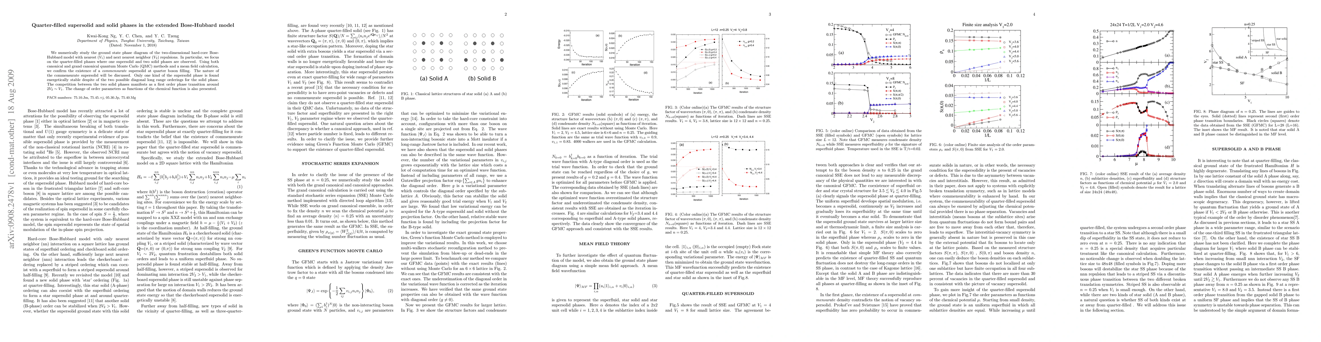 We numerically study the ground state phase diagram of the two-dimensional hard-core Bose-Hubbard model with nearest ($V_1$) and next nearest neighbor ($V_2$) repulsions. In particular, we focus on the quarter-filled phases where one supersolid and two solid phases are observed. Using both canonical and grand canonical quantum Monte Carlo (QMC) methods and a mean field calculation, we confirm the existence of a \textit{commensurate} supersolid at quarter boson filling. The nature of the commensurate supersolid will be discussed. Only one kind of the supersolid phase is found energetically stable despite of the two possible diagonal long range orderings for the solid phase. The competition between the two solid phases manifests as a first order phase transition around $2 V_2\sim V_1$. The change of order parameters as functions of the chemical function is also presented.