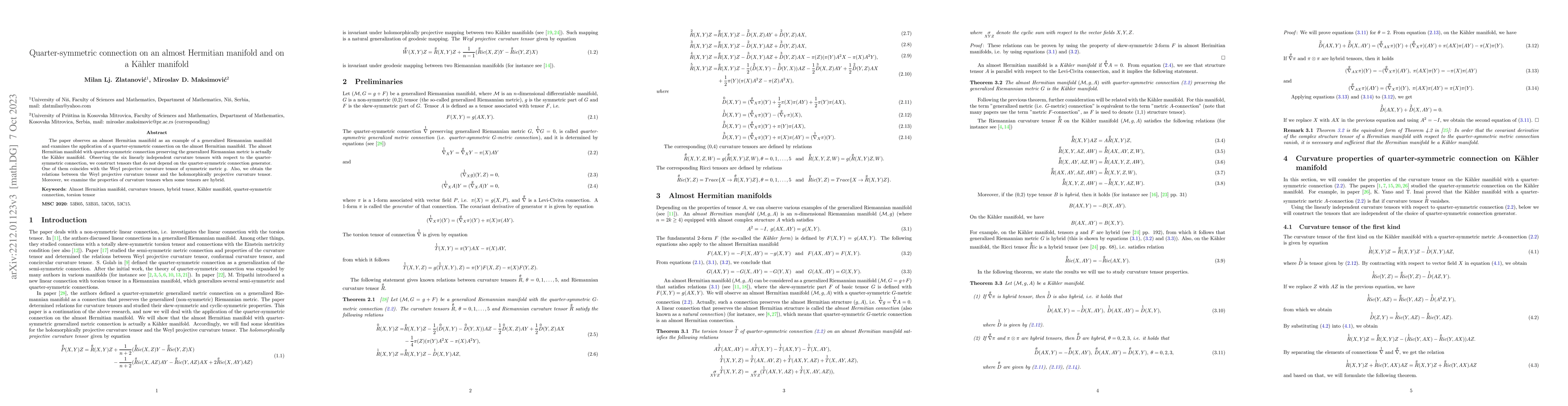 The paper observes an almost Hermitian manifold as an example of a generalized Riemannian manifold and examines the application of a quarter-symmetric connection on the almost Hermitian manifold. The almost Hermitian manifold with quarter-symmetric connection preserving the generalized Riemannian metric is actually the K\"ahler manifold. Observing the six linearly independent curvature tensors with respect to the quarter-symmetric connection, we construct tensors that do not depend on the quarter-symmetric connection generator. One of them coincides with the Weyl projective curvature tensor of symmetric metric $g$. Also, we obtain the relations between the Weyl projective curvature tensor and the holomorphically projective curvature tensor. Moreover, we examine the properties of curvature tensors when some tensors are hybrid.
