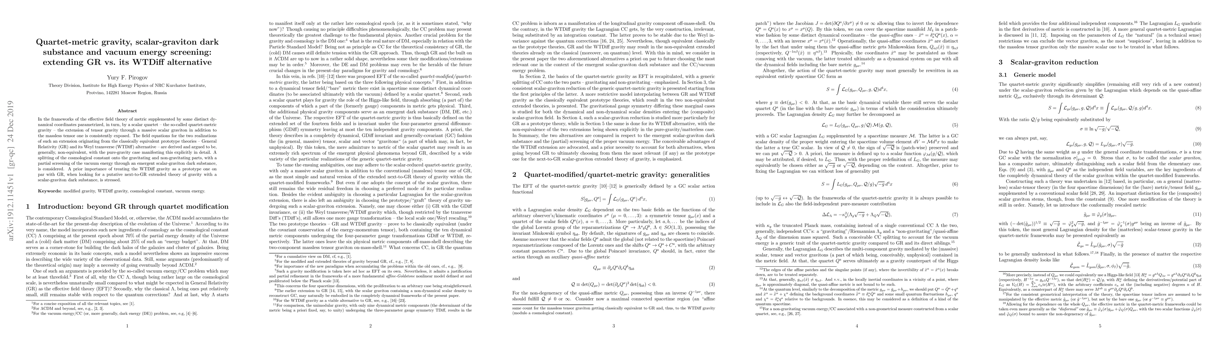 In the frameworks of the effective field theory of metric supplemented by some distinct dynamical coordinates parametrized, in turn, by a scalar quartet -- the so-called quartet-metric gravity -- the extension of tensor gravity through a massive scalar graviton in addition to the massless tensor one is consistently exposed. The field equations for the two realizations of such an extension originating from the classically equivalent prototype theories - General Relativity (GR) and its Weyl transverse (WTDiff) alternative - are derived and argued to be, generally, non-equivalent, with the pure-gravity case manifesting this explicitly in detail. A splitting of the cosmological constant onto the gravitating and non-gravitating parts, with a partial screening of the vacuum energy through an emergent scalar-graviton dark substance, is considered. A prior importance of treating the WTDiff gravity as a prototype one on par with GR, when looking for a putative next-to-GR extended theory of gravity with a scalar-graviton dark substance, is stressed.