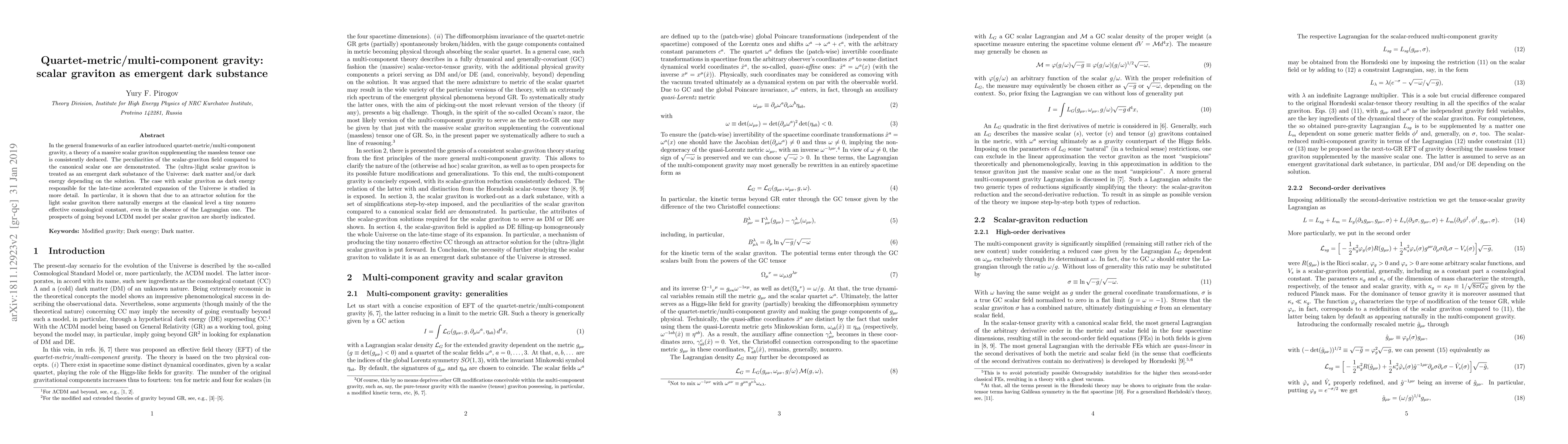 In the general frameworks of an earlier introduced quartet-metric/multi-component gravity, a theory of a massive scalar graviton supplementing the massless tensor one is consistently deduced. The peculiarities of the scalar-graviton field compared to the canonical scalar one are demonstrated. The light scalar graviton is treated as an emergent dark substance of the Universe: dark matter and/or dark energy depending on the solution. The case with scalar graviton as dark energy responsible for the late-time accelerated expansion of the Universe is studied in more detail. In particular, it is shown that due to an attractor solution for the light scalar graviton there naturally emerges at the classical level a tiny nonzero effective cosmological constant, even in the absence of the Lagrangian one. The prospects of going beyond LCDM model per scalar graviton are shortly indicated.