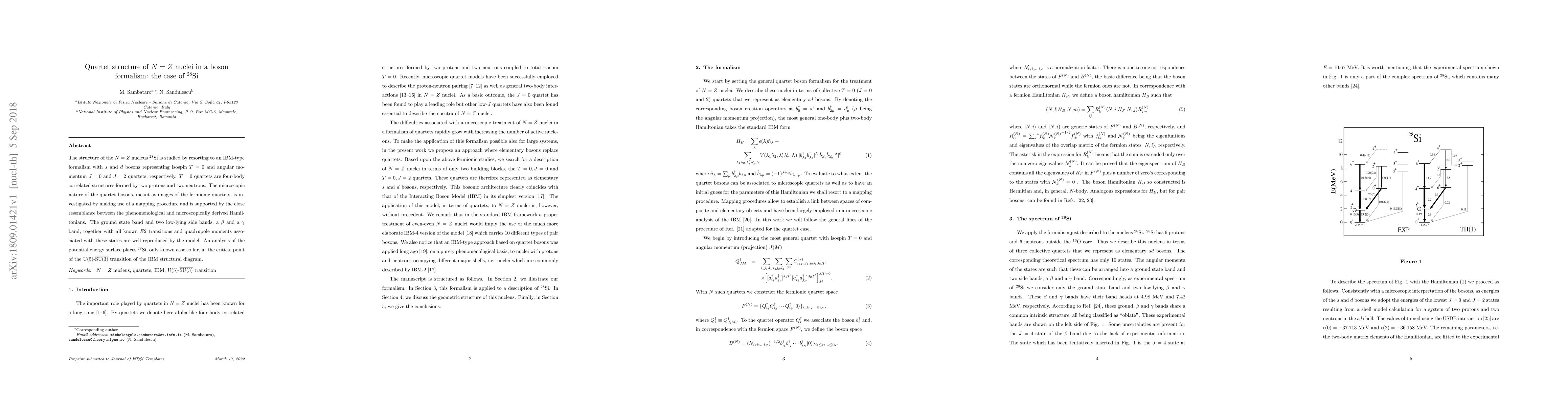 The structure of the $N=Z$ nucleus $^{28}$Si is studied by resorting to an IBM-type formalism with $s$ and $d$ bosons representing isospin $T=0$ and angular momentum $J=0$ and $J=2$ quartets, respectively. $T=0$ quartets are four-body correlated structures formed by two protons and two neutrons. The microscopic nature of the quartet bosons, meant as images of the fermionic quartets, is investigated by making use of a mapping procedure and is supported by the close resemblance between the phenomenological and microscopically derived Hamiltonians. The ground state band and two low-lying side bands, a $\beta$ and a $\gamma$ band, together with all known $E2$ transitions and quadrupole moments associated with these states are well reproduced by the model. An analysis of the potential energy surface places $^{28}$Si, only known case so far, at the critical point of the U(5)-$\overline{\rm SU(3)}$ transition of the IBM structural diagram.