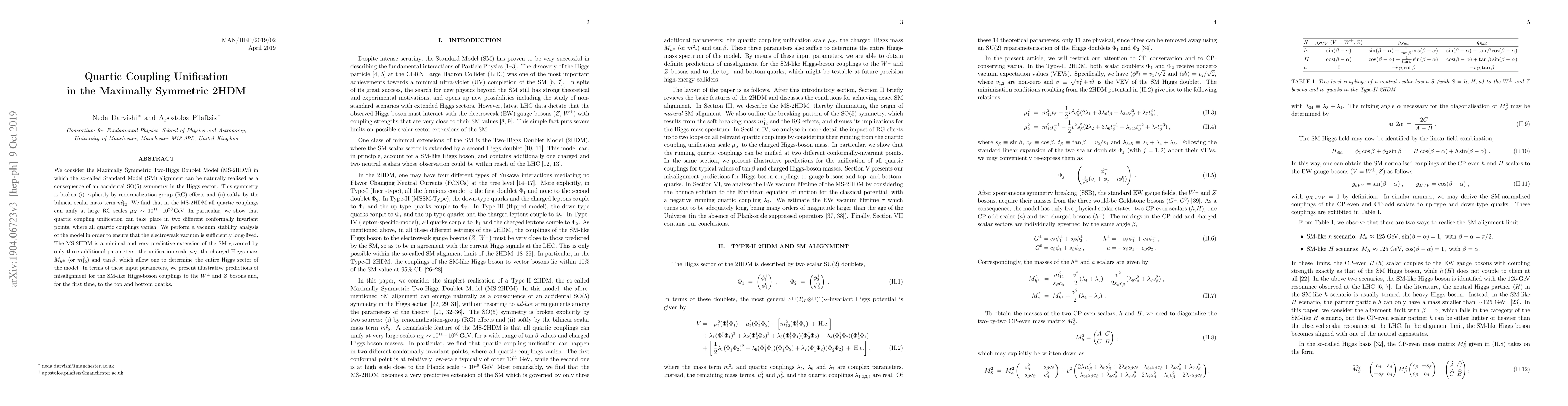 We consider the Maximally Symmetric Two-Higgs Doublet Model (MS-2HDM) in which the so-called Standard Model (SM) alignment can be naturally realised as a consequence of an accidental SO(5) symmetry in the Higgs sector. This symmetry is broken (i) explicitly by renormalization-group (RG) effects and (ii) softly by the bilinear scalar mass term $m^2_{12}$. We find that in the MS-2HDM all quartic couplings can unify at large RG scales $\mu_X \sim 10^{11}\,$-$\,10^{20}$ GeV. In particular, we show that quartic coupling unification can take place in two different conformally invariant points, where all quartic couplings vanish. We perform a vacuum stability analysis of the model in order to ensure that the electro-weak vacuum is sufficiently long-lived. The MS-2HDM is a minimal and very predictive extension of the SM governed by only three additional parameters: the unification scale $\mu_X$, the charged Higgs mass $M_{h^{\pm}}$ (or $m^2_{12}$) and $\tan\beta$, which allow one to determine the entire Higgs sector of the model. In terms of these input parameters, we present illustrative predictions of misalignment for the SM-like Higgs-boson couplings to the $W^\pm$ and $Z$ bosons and, for the first time, to the top and bottom quarks.