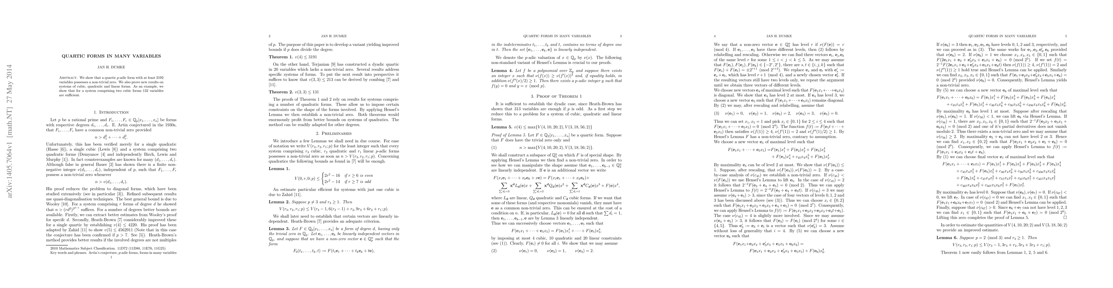 Summary: This paper demonstrates that a quartic $p$-adic form with at least $3192$ variables has a non-trivial zero. Additionally, it presents new findings on systems of cubic, quadratic, and linear forms, specifically showing that a system of two cubic forms requires at least $132$ variables.