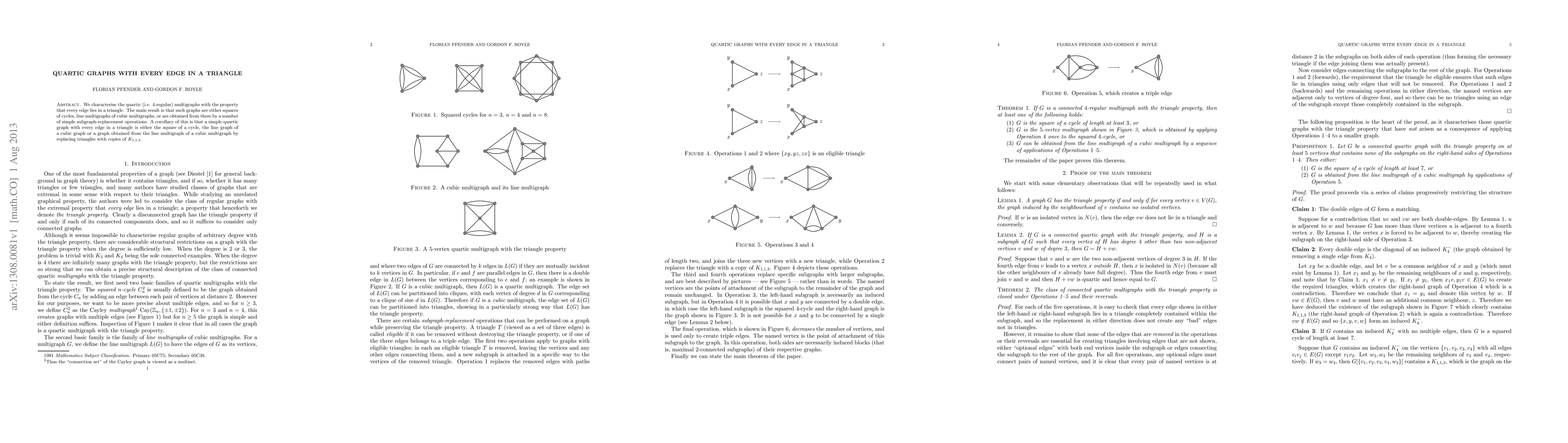 This paper characterizes quartic multigraphs where every edge is part of a triangle, concluding they are either squares of cycles, line multigraphs of cubic multigraphs, or derived from these through simple operations. The corollary specifies that simple quartic graphs with this property are either cycle squares, line graphs of cubic graphs, or modified line multigraphs.