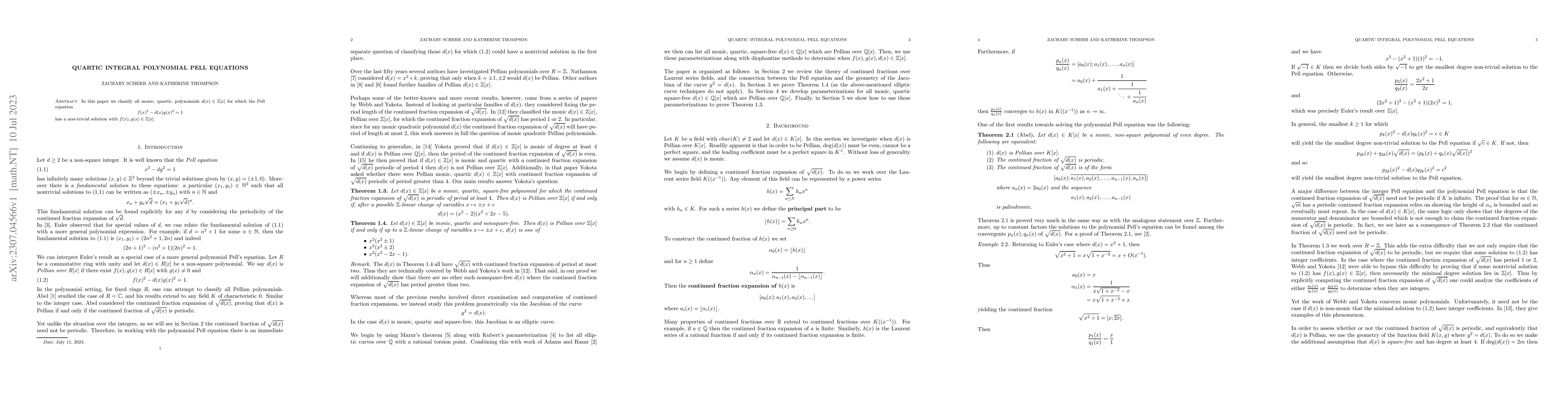 This paper classifies all monic quartic integral polynomials for which the Pell equation $f(x)^2 - d(x)g(x)^2 = 1$ has non-trivial solutions where $f(x)$ and $g(x)$ are polynomials with integer coefficients. The focus is on understanding the structure and properties of these polynomials.