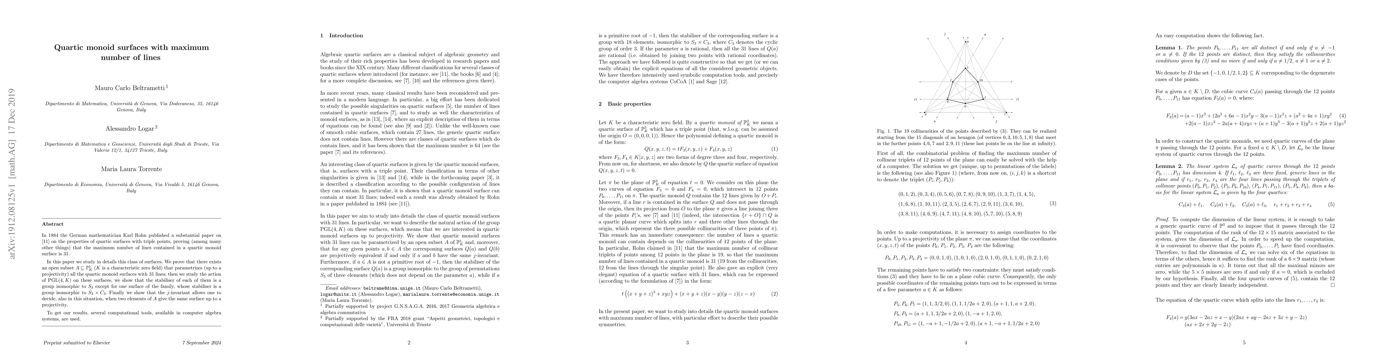 This paper investigates quartic monoid surfaces, confirming that the maximum number of lines they can contain is 31, as proven by Karl Rohn. It demonstrates that a subset $A$ in $\mathbb{P}^1_K$ parametrizes these surfaces and analyzes the action of $\mathrm{PGL}(4,K)$, revealing the stabilizers' groups, including $S_3$ and $S_3 \times C_3$, and uses computational tools for its findings.