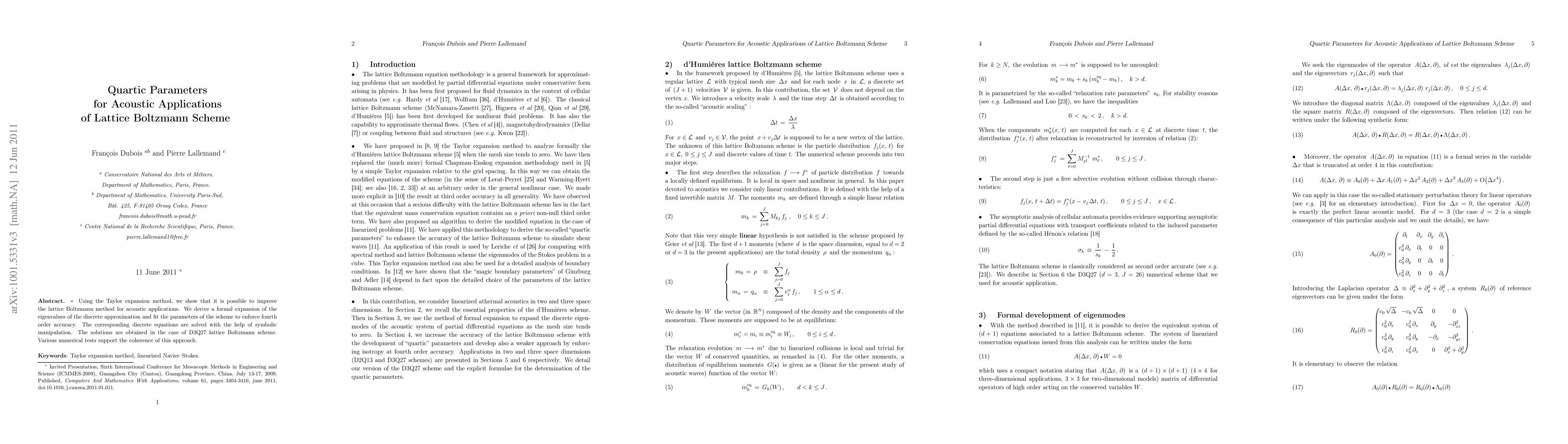 This paper improves the lattice Boltzmann method for acoustic applications by deriving quartic parameters through Taylor expansion to achieve fourth-order accuracy. Numerical tests validate the effectiveness of the proposed D3Q27 lattice scheme.