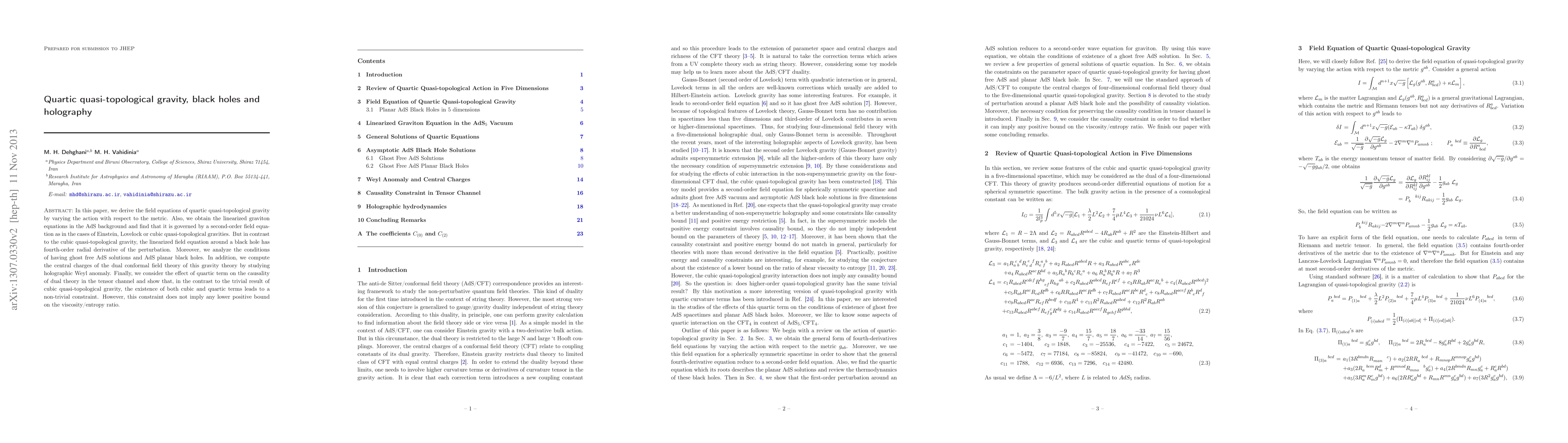 The paper presents a detailed derivation of field equations, linearized graviton equations, and central charges for quartic quasi-topological gravity, along with an analysis of causality constraints in the dual theory.