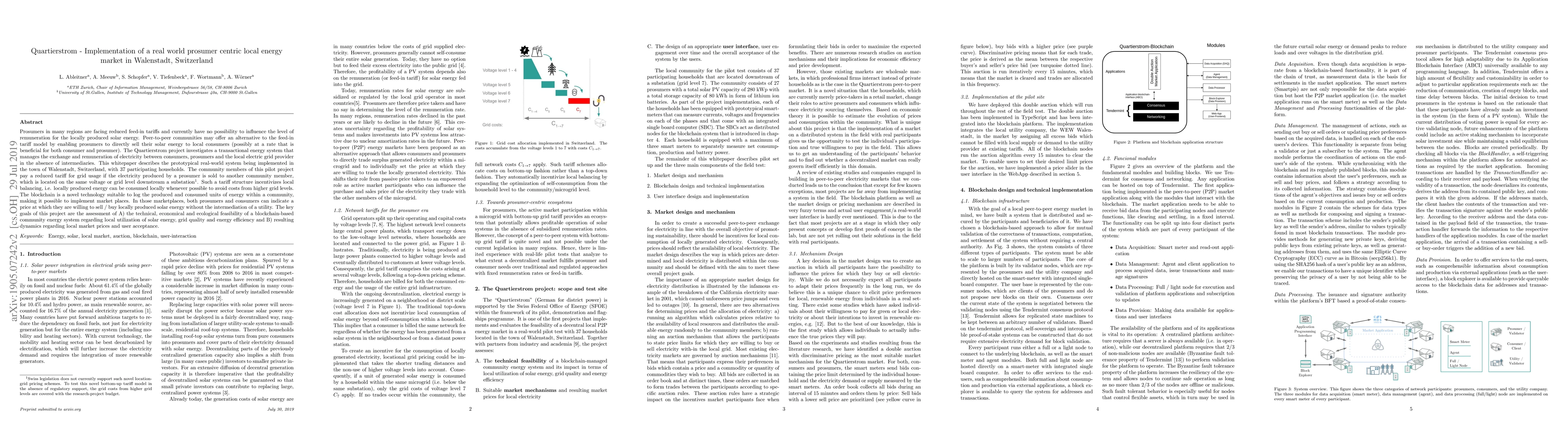Prosumers in many regions are facing reduced feed-in tariffs and currently have no possibility to influence the level of remuneration for the locally produced solar energy. Peer-to-peer communities may offer an alternative to the feed-in tariff model by enabling prosumers to directly sell their solar energy to local consumers (possibly at a rate that is beneficial for both consumer and prosumer). The Quartierstrom project investigates a transactional energy system that manages the exchange and remuneration of electricity between consumers, prosumers and the local electric grid provider in the absence of intermediaries. This whitepaper describes the prototypical real-world system being implemented in the town of Walenstadt, Switzerland, with 37 participating households. The community members of this pilot project pay a reduced tariff for grid usage if the electricity produced by a prosumer is sold to another community member, which is located on the same voltage or grid level downstream a substation1. Such a tariff structure incentivizes local balancing, i.e. locally produced energy can be consumed locally whenever possible to avoid costs from higher grid levels. The blockchain is a novel technology suitable to log the produced and consumed units of energy within a community, making it possible to implement market places. In those marketplaces, both prosumers and consumers can indicate a price at which they are willing to sell / buy locally produced solar energy without the intermediation of a utility. The key goals of this project are the assessment of A) the technical, economical and ecological feasibility of a blockchain-based community energy system regarding local utilization of solar energy, grid quality and energy efficiency and B) resulting dynamics regarding local market prices and user acceptance.
