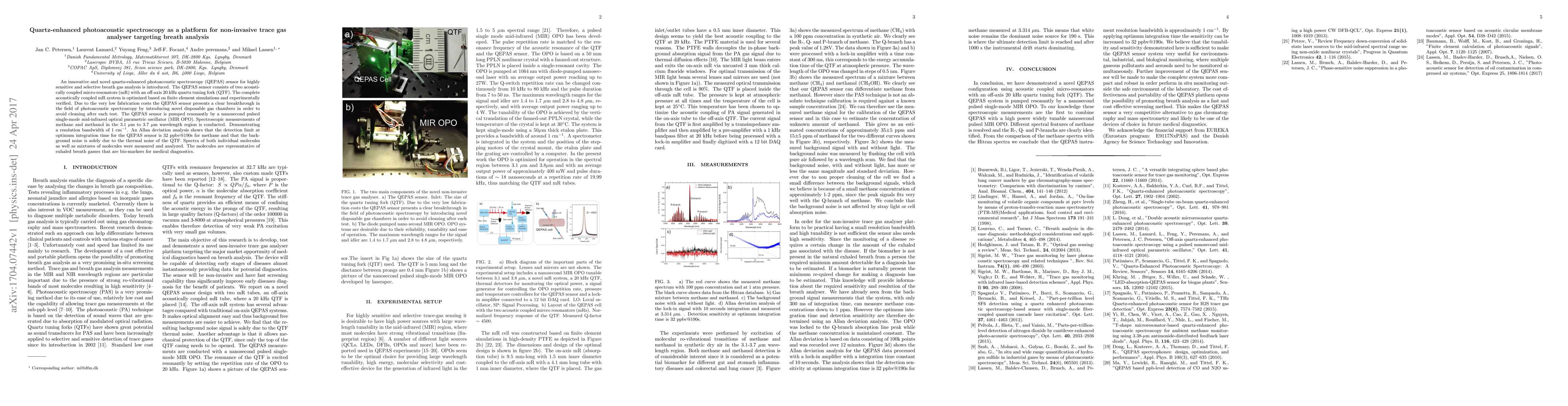 An innovative and novel quartz-enhanced photoacoustic spectroscopy (QEPAS) sensor for highly sensitive and selective breath gas analysis is introduced. The QEPAS sensor consists of two acoustically coupled micro-resonators (mR) with an off-axis 20 kHz quartz tuning fork (QTF). The complete acoustically coupled mR system is optimized based on finite element simulations and experimentally verified. Due to the very low fabrication costs the QEPAS sensor presents a clear breakthrough in the field of photoacoustic spectroscopy by introducing novel disposable gas chambers in order to avoid cleaning after each test. The QEPAS sensor is pumped resonantly by a nanosecond pulsed single-mode mid-infrared optical parametric oscillator (MIR OPO). Spectroscopic measurements of methane and methanol in the 3.1 $\mu$m to 3.7 $\mu$m wavelength region is conducted. Demonstrating a resolution bandwidth of 1 cm$^{-1}$. An Allan deviation analysis shows that the detection limit at optimum integration time for the QEPAS sensor is 32 ppbv@190s for methane and that the background noise is solely due to the thermal noise of the QTF. Spectra of both individual molecules as well as mixtures of molecules were measured and analyzed. The molecules are representative of exhaled breath gasses that are bio-markers for medical diagnostics.