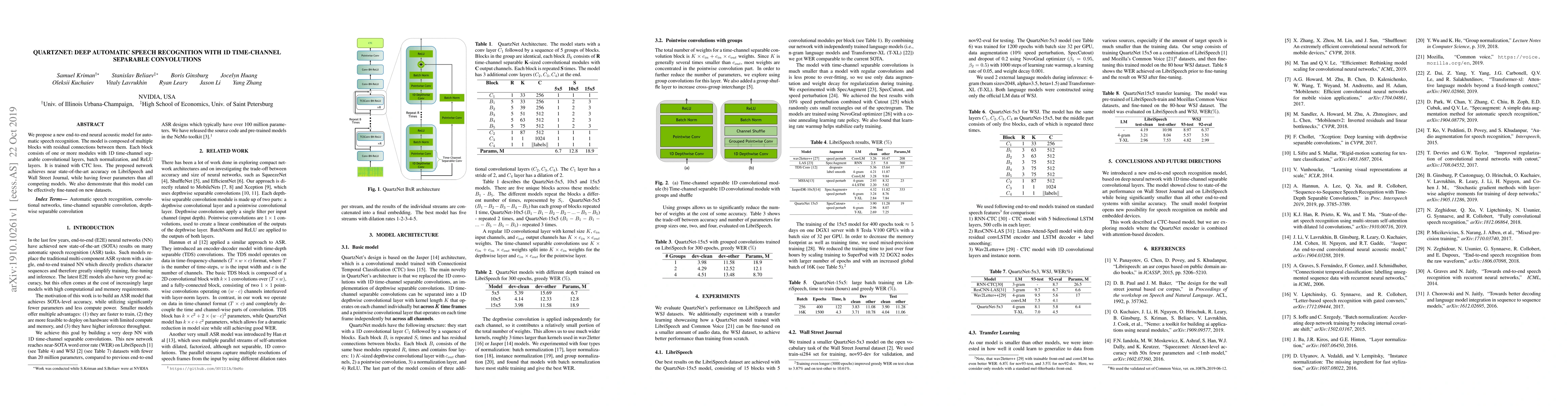 QuartzNet introduces an efficient end-to-end neural model for automatic speech recognition using 1D time-channel separable convolutions, achieving near state-of-the-art accuracy with fewer parameters on LibriSpeech and WSJ datasets. The model's design allows for effective fine-tuning on new datasets.