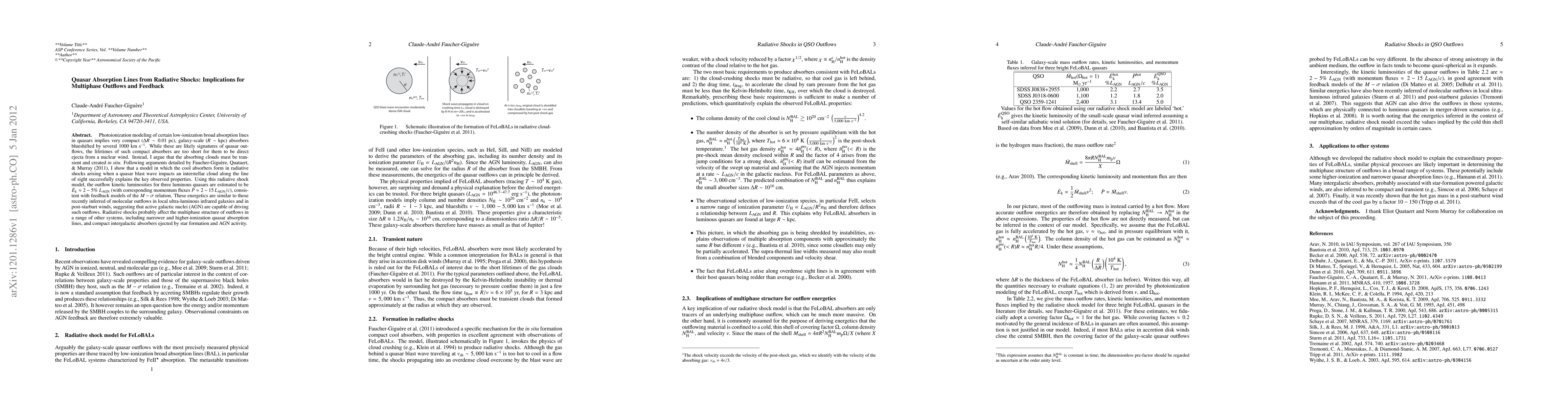 Photoionization modeling of certain low-ionization broad absorption lines in quasars implies very compact (Delta R~0.01 pc), galaxy-scale (R kpc) absorbers blueshifted by several 1000 km s^-1. While these are likely signatures of quasar outflows, the lifetimes of such compact absorbers are too short for them to be direct ejecta from a nuclear wind. Instead, I argue that the absorbing clouds must be transient and created in situ. Following arguments detailed by Faucher-Giguere, Quataert, & Murray (2011), I show that a model in which the cool absorbers form in radiative shocks arising when a quasar blast wave impacts an interstellar cloud along the line of sight successfully explains the key observed properties. Using this radiative shock model, the outflow kinetic luminosities for three luminous quasars are estimated to be Edot,k~2-5% L_AGN (with corresponding momentum fluxes Pdot~2-15 L_AGN/c), consistent with feedback models of the M-sigma relation. These energetics are similar to those recently inferred of molecular outflows in local ultra-luminous infrared galaxies and in post-starburt winds, suggesting that active galactic nuclei (AGN) are capable of driving such outflows. Radiative shocks probably affect the multiphase structure of outflows in a range of other systems, including narrower and higher-ionization quasar absorption lines, and compact intergalactic absorbers ejected by star formation and AGN activity.