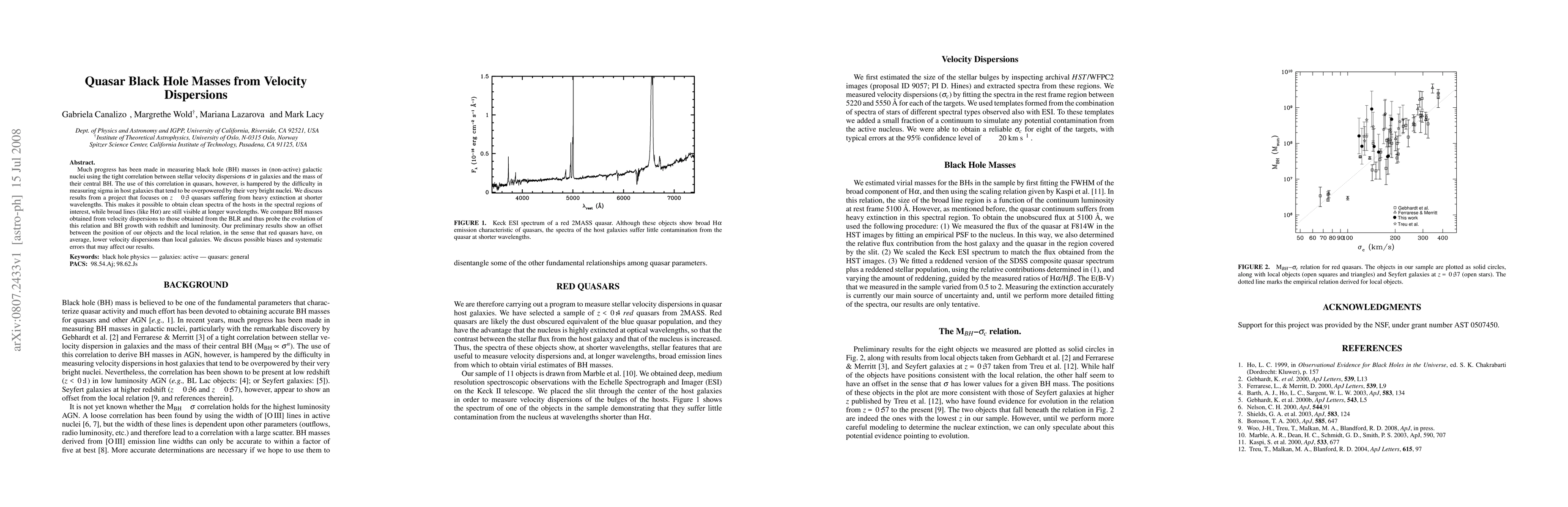 Much progress has been made in measuring black hole (BH) masses in (non-active) galactic nuclei using the tight correlation between stellar velocity dispersions (sigma) in galaxies and the mass of their central BH. The use of this correlation in quasars, however, is hampered by the difficulty in measuring sigma in host galaxies that tend to be overpowered by their bright nuclei. We discuss results from a project that focuses on z~0.3 quasars suffering from heavy extinction at shorter wavelengths. This makes it possible to obtain clean spectra of the hosts in the spectral regions of interest, while broad lines (like H-alpha) are still visible at longer wavelengths. We compare BH masses obtained from velocity dispersions to those obtained from the broad line region and thus probe the evolution of this relation and BH growth with redshift and luminosity. Our preliminary results show an offset between the position of our objects and the local relation, in the sense that red quasars have, on average, lower velocity dispersions than local galaxies. We discuss possible biases and systematic errors that may affect our results.