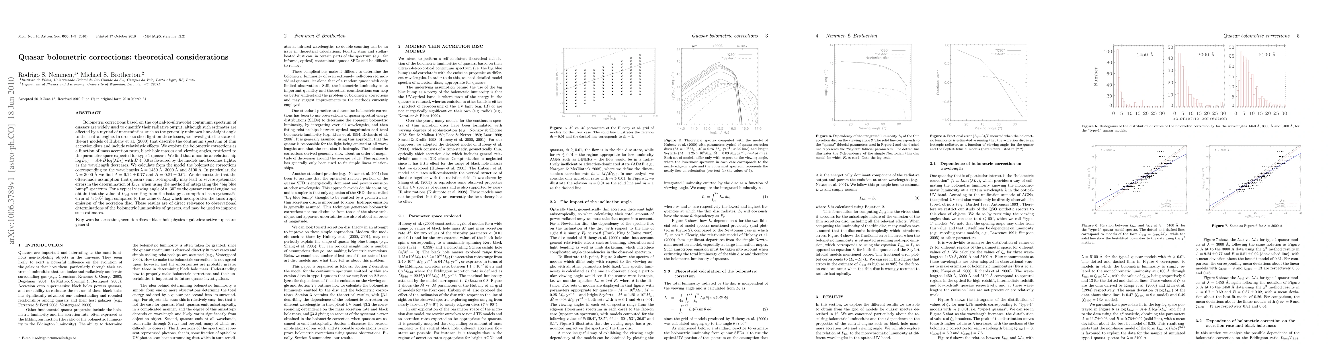 Bolometric corrections based on the optical-to-ultraviolet continuum spectrum of quasars are widely used to quantify their radiative output, although such estimates are affected by a myriad of uncertainties, such as the generally unknown line-of-sight angle to the central engine. In order to shed light on these issues, we investigate the state-of-the-art models of Hubeny et al. that describe the continuum spectrum of thin accretion discs and include relativistic effects. We explore the bolometric corrections as a function of mass accretion rates, black hole masses and viewing angles, restricted to the parameter space expected for type-1 quasars. We find that a nonlinear relationship log L_bol=A + B log(lambda L_lambda) with B<=0.9 is favoured by the models and becomes tighter as the wavelength decreases. We calculate from the model the bolometric corrections corresponding to the wavelengths lambda = 1450A, 3000A and 5100A. In particular, for lambda=3000A we find A=9.24 +- 0.77 and B=0.81 +- 0.02. We demonstrate that the often-made assumption that quasars emit isotropically may lead to severe systematic errors in the determination of L_bol, when using the method of integrating the "big blue bump" spectrum. For a typical viewing angle of ~30 degrees to the quasar central engine, we obtain that the value of L_bol resulting from the isotropy assumption has a systematic error of ~30% high compared to the value of L_bol which incorporates the anisotropic emission of the accretion disc. These results are of direct relevance to observational determinations of the bolometric luminosities of quasars, and may be used to improve such estimates.