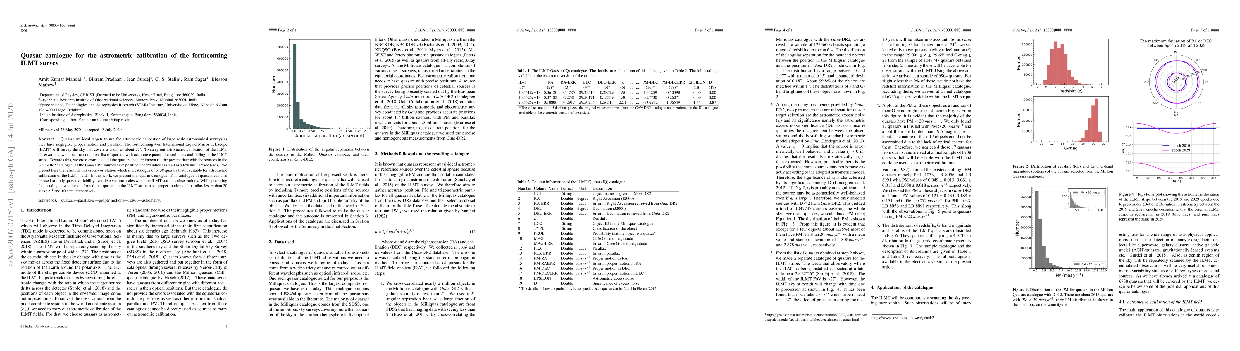 This paper compiles a catalogue of 6738 quasars with accurate equatorial coordinates for the astrometric calibration of the forthcoming ILMT survey, cross-correlating known quasars with Gaia-DR2 data. The catalogue ensures negligible proper motion and parallax, suitable for both calibration and future variability studies.