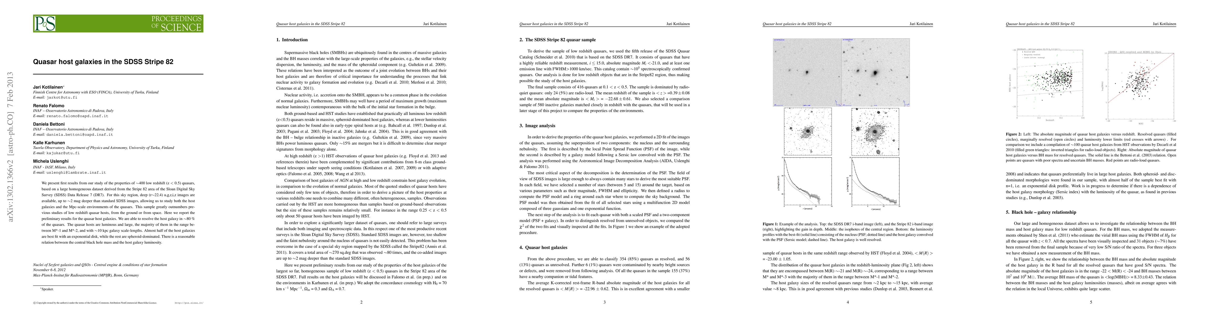 This study investigates the properties of ~400 low redshift quasars in the SDSS Stripe 82, revealing that most host galaxies are luminous and large, with a significant correlation between the central black hole mass and the host galaxy luminosity. The majority of resolved hosts exhibit exponential disk or spheroid-dominated structures.