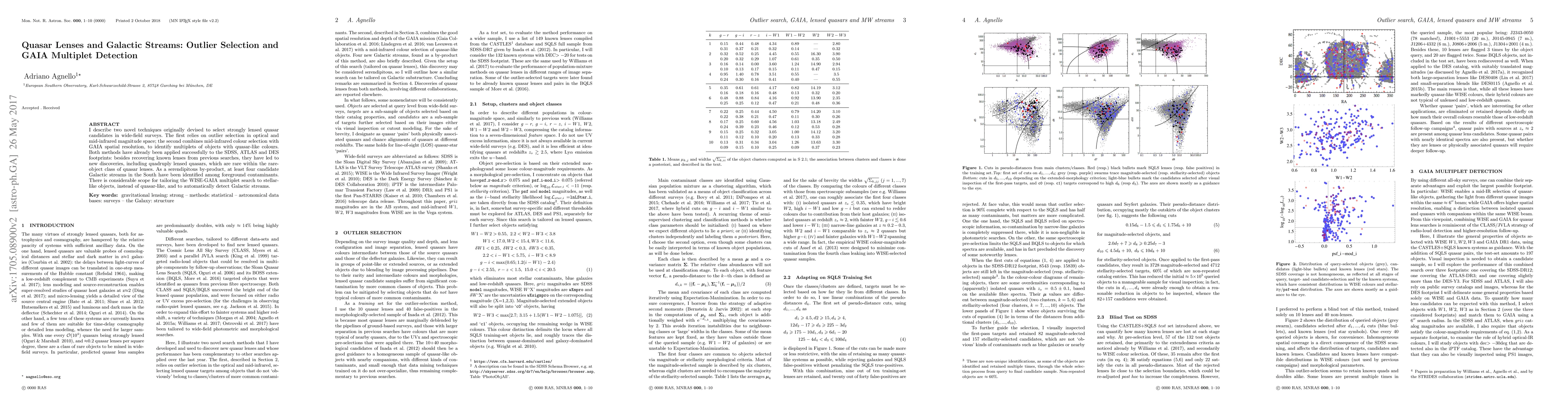 This paper introduces two techniques for identifying strongly lensed quasars: outlier selection in optical and mid-infrared magnitude space, and a method combining mid-infrared colour selection with GAIA spatial resolution to detect quasar-like multiplets. These methods have successfully uncovered new lensed quasars and identified candidate Galactic streams as serendipitous findings.