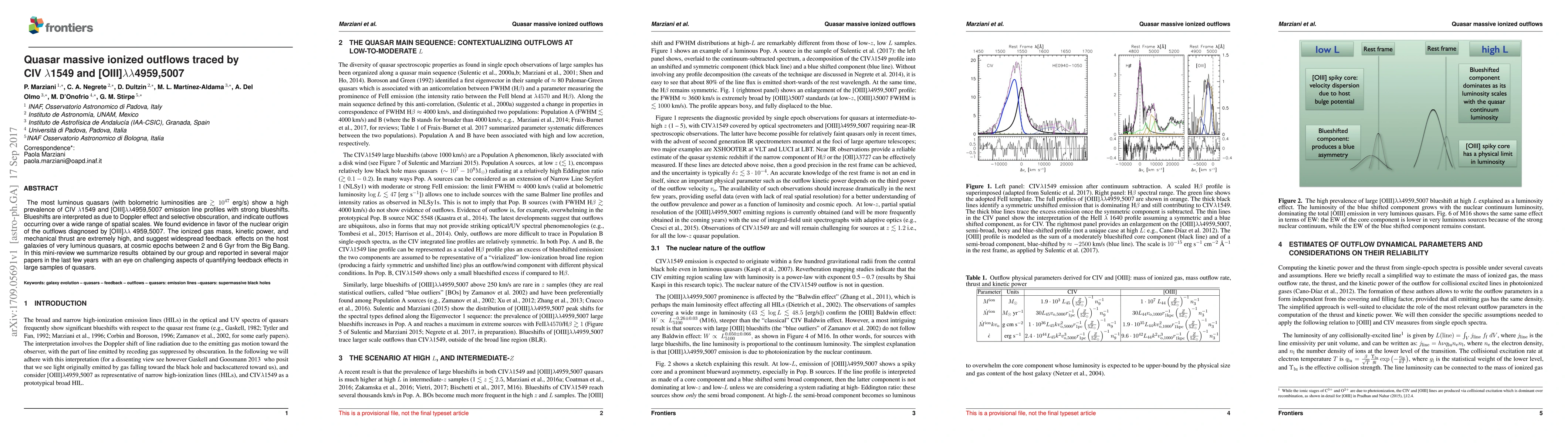 The most luminous quasars (with bolometric luminosities are 1E47 erg/s) show a high prevalence of CIV {\lambda}1549 and [OIII]{\lambda}{\lambda}4959,5007 emission line profiles with strong blueshifts. Blueshifts are interpreted as due to Doppler effect and selective obscuration, and indicate outflows occurring over a wide range of spatial scales. We found evidence in favor of the nuclear origin of the outflows diagnosed by [OIII]{\lambda}{\lambda} 4959,5007. The ionized gas mass, kinetic power, and mechanical thrust are extremely high, and suggest widespread feedback effects on the host galaxies of very luminous quasars, at cosmic epochs between 2 and 6 Gyr from the Big Bang. In this mini-review we summarize results obtained by our group and reported in several major papers in the last few years with an eye on challenging aspects of quantifying feedback effects in large samples of quasars.