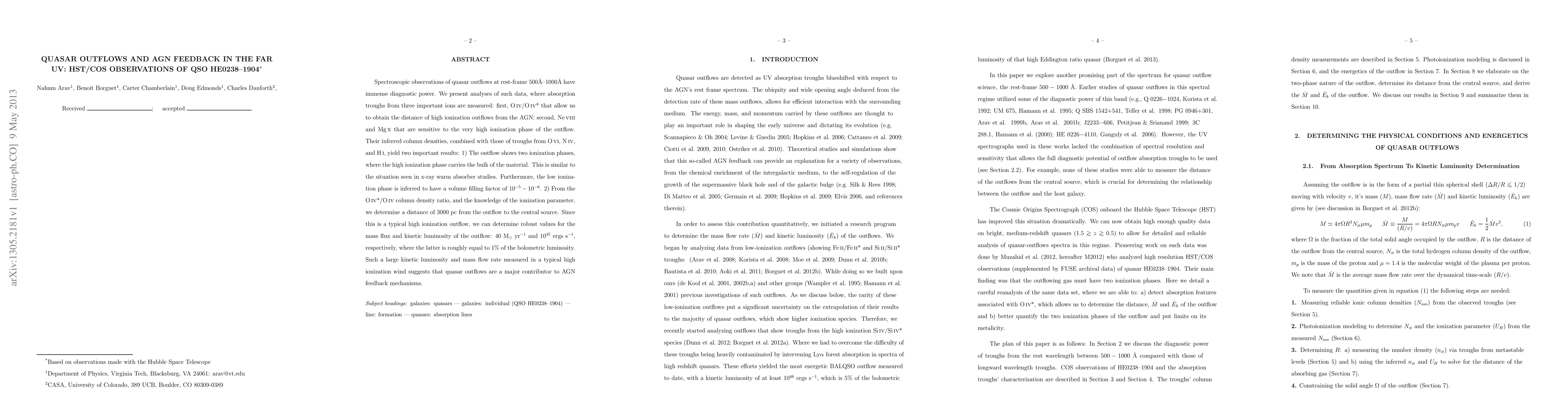 Spectroscopic observations of quasar outflows at rest-frame 500-1000 Angstrom have immense diagnostic power. We present analyses of such data, where absorption troughs from three important ions are measured: first, O IV and O IV* that allow us to obtain the distance of high ionization outflows from the AGN; second, Ne VIII and Mg X that are sensitive to the very high ionization phase of the outflow. Their inferred column densities, combined with those of troughs from O VI, N IV, and H I, yield two important results: 1) The outflow shows two ionization phases, where the high ionization phase carries the bulk of the material. This is similar to the situation seen in x-ray warm absorber studies. Furthermore, the low ionization phase is inferred to have a volume filling factor of 10^(-5)-10^(-6). 2) From the O IV to O IV* column density ratio, and the knowledge of the ionization parameter, we determine a distance of 3000 pc. from the outflow to the central source. Since this is a typical high ionization outflow, we can determine robust values for the mass flux and kinetic luminosity of the outflow: 40 solar masses per year and 10^45 ergs/s, respectively, where the latter is roughly equal to 1% of the bolometric luminosity. Such a large kinetic luminosity and mass flow rate measured in a typical high ionization wind suggests that quasar outflows are a major contributor to AGN feedback mechanisms.