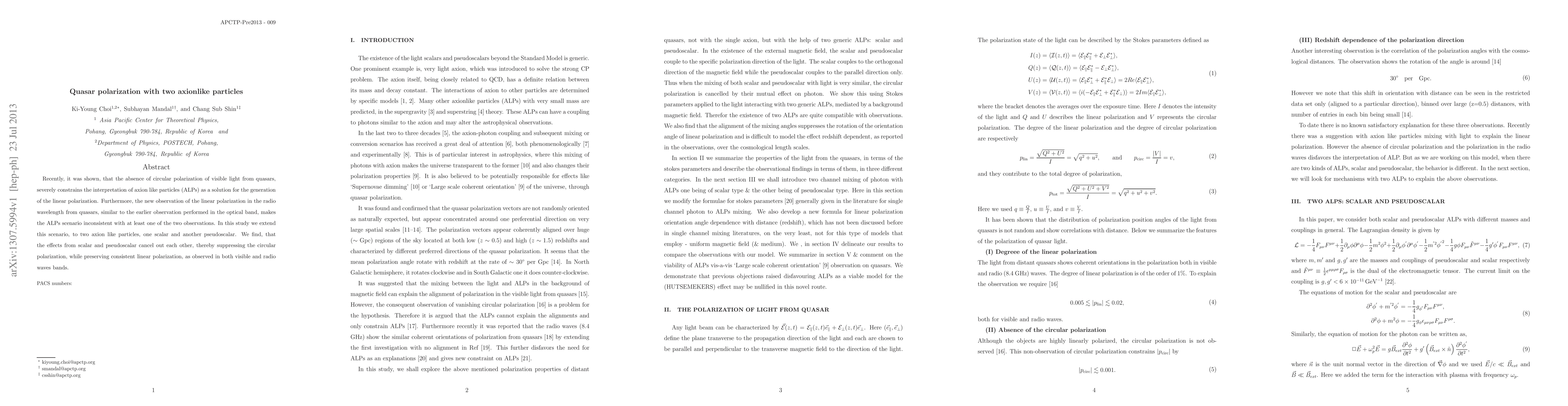 Recently, it was shown, that the absence of circular polarization of visible light from quasars, severely constrains the interpretation of axion like particles (ALPs) as a solution for the generation of the linear polarization. Furthermore, the new observation of the linear polarization in the radio wavelength from quasars, similar to the earlier observation performed in the optical band, makes the ALPs scenario inconsistent with at least one of the two observations. In this study we extend this scenario, to two axion like particles, one scalar and another pseudoscalar. We find, that the effects from scalar and pseudoscalar cancel out each other, thereby suppressing the circular polarization, while preserving consistent linear polarization, as observed in both visible and radio waves bands.