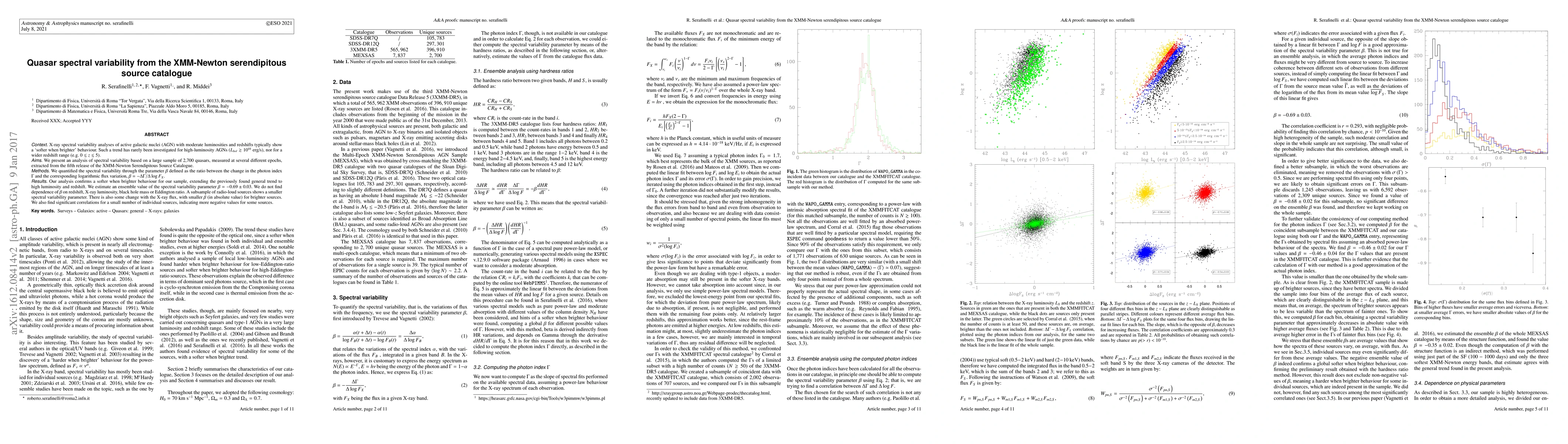This study analyzes spectral variability in a large sample of 2,700 quasars from the XMM-Newton Serendipitous Source Catalogue, confirming a "softer when brighter" trend for high-luminosity AGNs across a wide redshift range. The spectral variability parameter $\beta$ is found to be $-0.69\pm0.03$, with no significant dependence on redshift, black hole mass, or other factors.