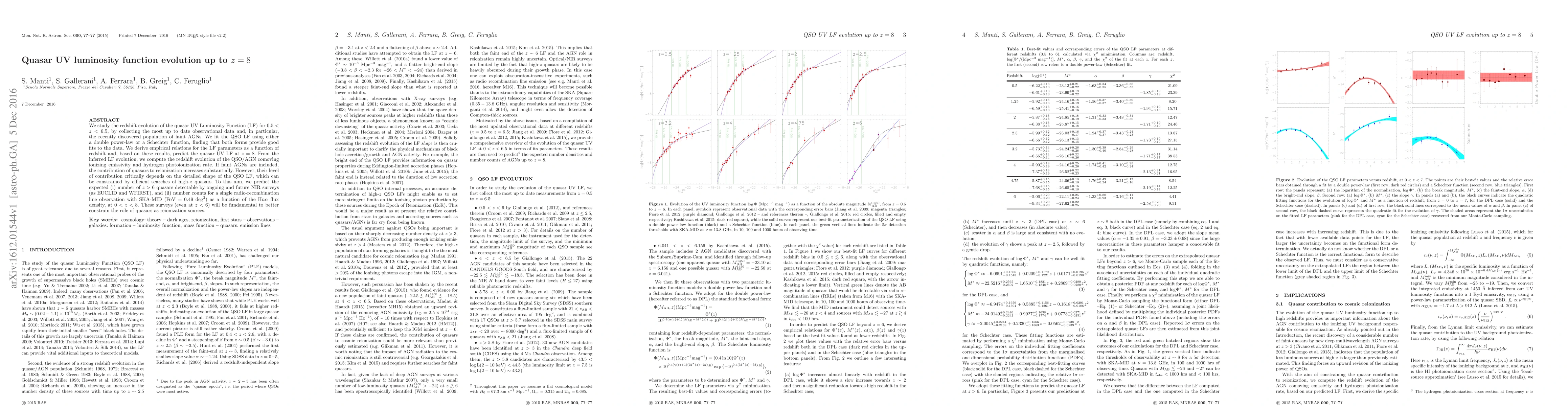 Researchers studied quasar UV luminosity function evolution up to z=8, finding that both a double power-law and Schechter function provide good fits to the data, with faint AGNs contributing substantially to reionization.
