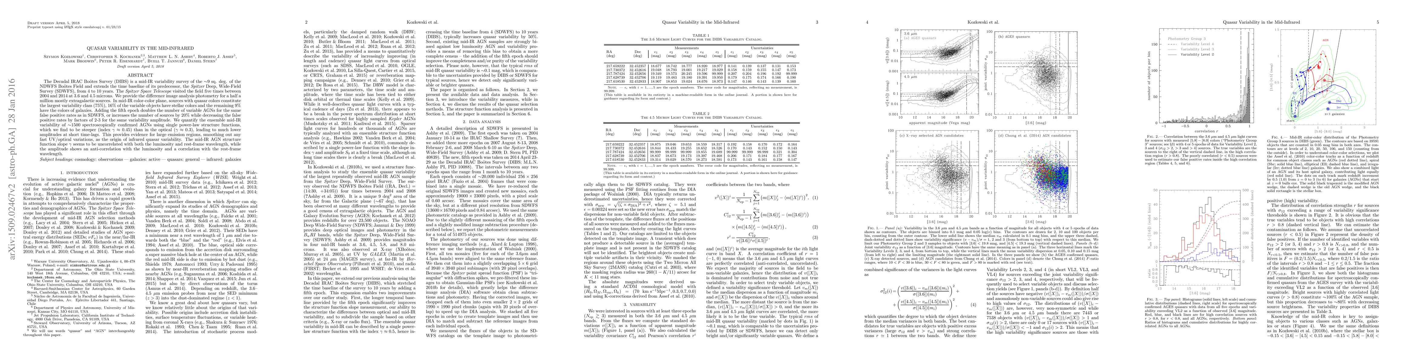This study analyzes mid-infrared variability of quasars using the Decadal IRAC Bootes Survey, extending the time baseline to 10 years. It finds that quasars constitute the largest variability class, with steep mid-IR variability slopes indicating large emission regions. The mid-IR variability amplitude correlates inversely with luminosity and positively with rest-frame wavelength.