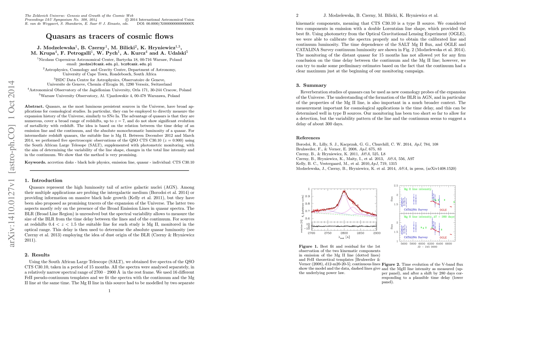 Quasars, as the most luminous persistent sources in the Universe, have broad applications for cosmological studies. In particular, they can be employed to directly measure the expansion history of the Universe, similarly to SNe Ia. The advantage of quasars is that they are numerous, cover a broad range of redshifts, up to $z = 7$, and do not show significant evolution of metallicity with redshift. The idea is based on the relation between the time delay of an emission line and the continuum, and the absolute monochromatic luminosity of a quasar. For intermediate redshift quasars, the suitable line is Mg II. Between December 2012 and March 2014, we performed five spectroscopic observations of the QSO CTS C30.10 ($z = 0.900$) using the South African Large Telesope (SALT), supplemented with photometric monitoring, with the aim of determining the variability of the line shape, changes in the total line intensity and in the continuum. We show that the method is very promising.