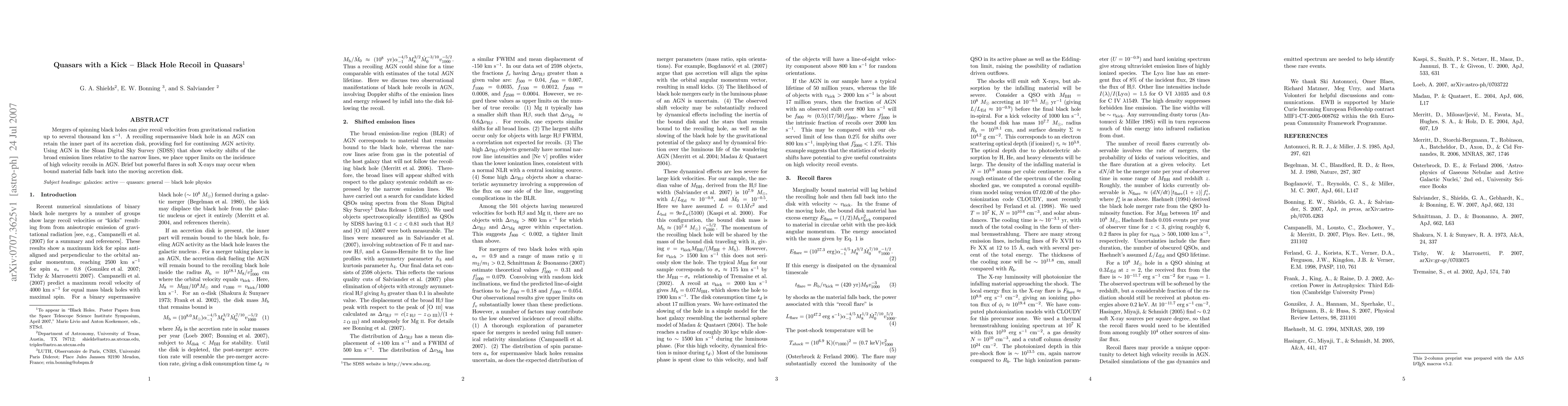 Mergers of spinning black holes can give recoil velocities from gravitational radiation up to several thousand km/s. A recoiling supermassive black hole in an AGN can retain the inner part of its accretion disk, providing fuel for continuing AGN activity. Using AGN in the Sloan Digital Sky Survey (SDSS) that show velocity shifts of the broad emission lines relative to the narrow lines, we place upper limits on the incidence of high velocity recoils in AGN. Brief but powerful flares in soft X-rays may occur when bound material falls back into the moving accretion disk.