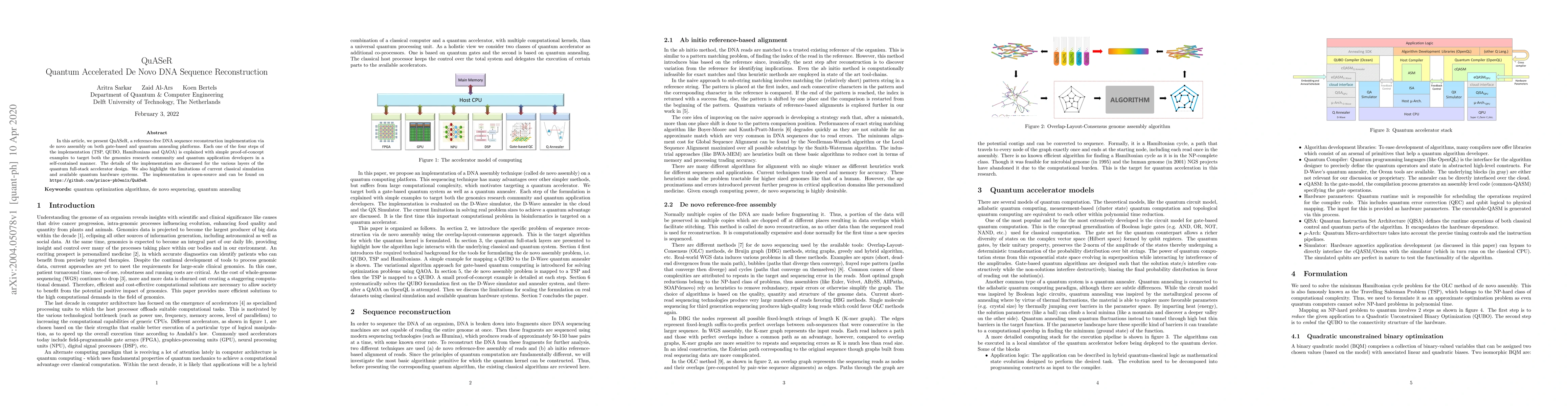QuASeR is a quantum-accelerated tool for de novo DNA sequence reconstruction using both gate-based and quantum annealing platforms. The paper details its four-step implementation and provides open-source access for the genomics and quantum communities, while also discussing current quantum hardware limitations.