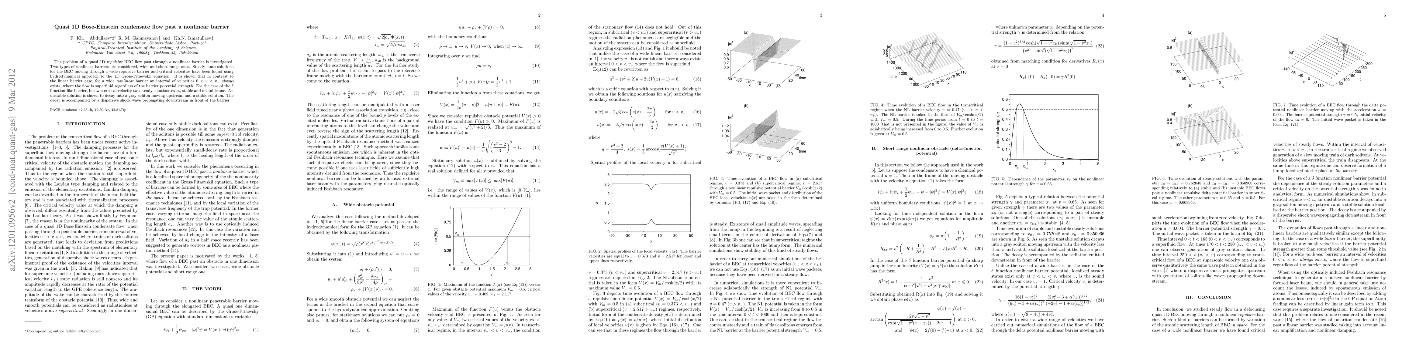 The problem of a quasi 1D {\it repulsive} BEC flow past through a nonlinear barrier is investigated. Two types of nonlinear barriers are considered, wide and short range ones. Steady state solutions for the BEC moving through a wide repulsive barrier and critical velocities have been found using hydrodynamical approach to the 1D Gross-Pitaevskii equation. It is shown that in contrast to the linear barrier case, for a wide {\it nonlinear} barrier an interval of velocities $0 < v < v_-$ {\it always} exists, where the flow is superfluid regardless of the barrier potential strength. For the case of the $\delta$ function-like barrier, below a critical velocity two steady solutions exist, stable and unstable one. An unstable solution is shown to decay into a gray soliton moving upstream and a stable solution. The decay is accompanied by a dispersive shock wave propagating downstream in front of the barrier.