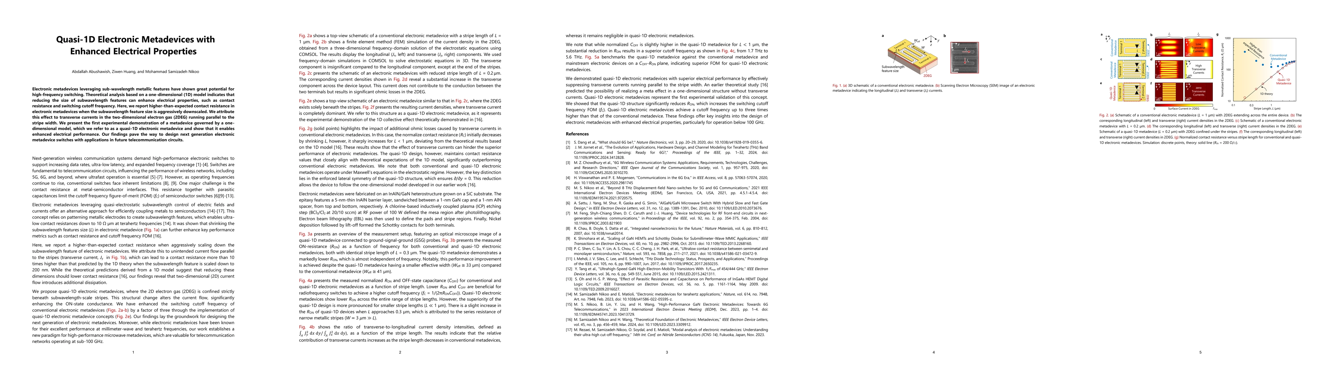 Electronic metadevices leveraging sub-wavelength metallic features have shown great potential for high-frequency switching. Theoretical analysis based on a one-dimensional (1D) model indicates that reducing the size of subwavelength features can enhance electrical properties, such as contact resistance and switching cutoff frequency. Here, we report higher-than-expected contact resistance in electronic metadevices when the subwavelength feature size is aggressively downscaled. We attribute this effect to transverse currents in the two-dimensional electron gas (2DEG) running parallel to the stripe width. We present the first experimental demonstration of a metadevice governed by a one-dimensional model, which we refer to as a quasi-1D electronic metadevice and show that it enables enhanced electrical performance. Our findings pave the way to design next generation electronic metadevice switches with applications in future telecommunication circuits.