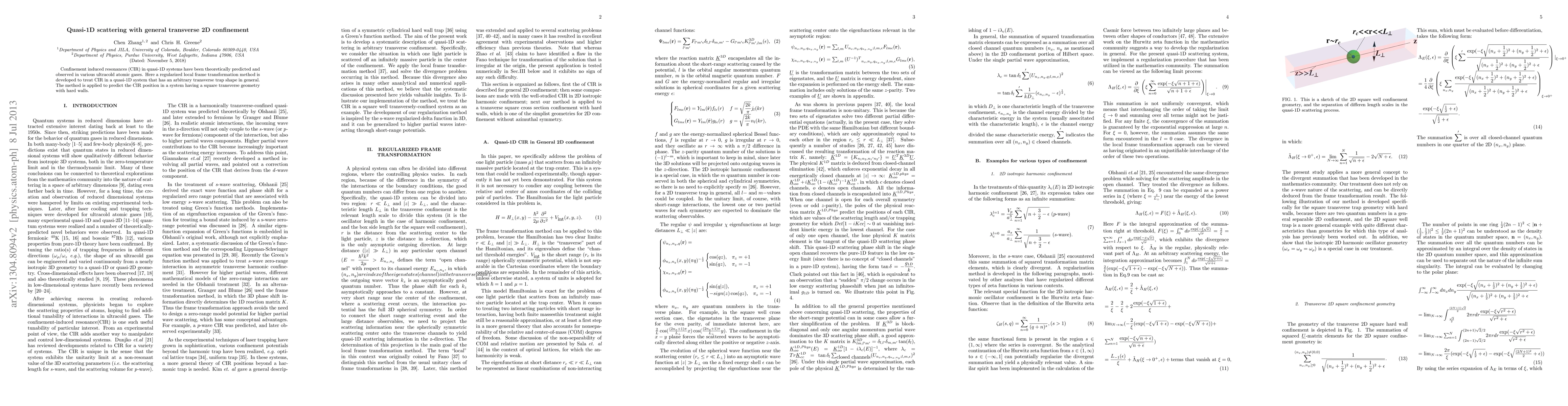 This paper develops a regularized local frame transformation method to analyze confinement induced resonances (CIR) in quasi-1D systems with arbitrary transverse 2D confinement shapes. The method is demonstrated by predicting CIR positions in a quasi-1D system with a square well transverse geometry.