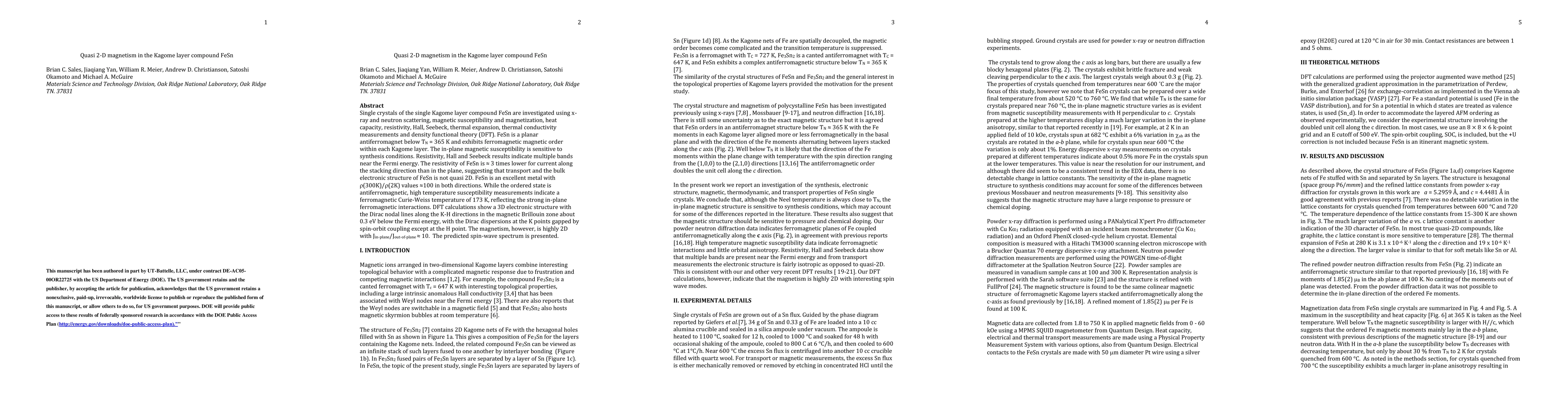 FeSn exhibits quasi 2-D magnetism in its Kagome layer, displaying ferromagnetic order within layers and antiferromagnetic order across layers, with a strong in-plane magnetic susceptibility and a 3D electronic structure featuring Dirac nodal lines.