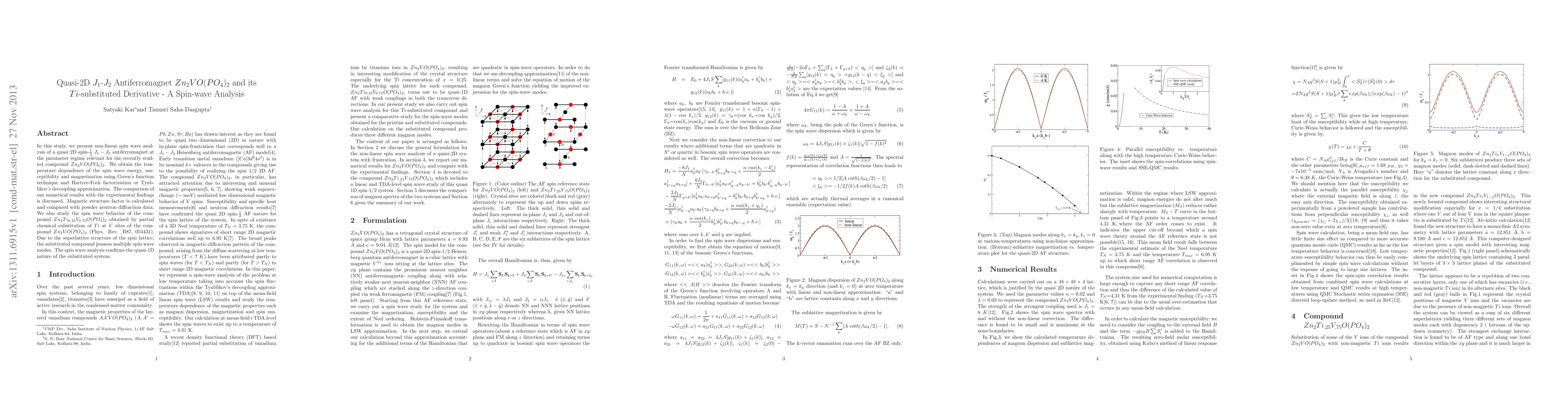 In this study, we present non-linear spin wave analysis of a quasi 2D spin-$\frac{1}{2}$ $J_1-J_2$ antiferromagnet at the parameter regime relevant for the recently studied compound $Zn_2VO(PO_4)_2$. We obtain the temperature dependence of the spin wave energy, susceptibility and magnetization using Green's function technique and Hartree-Fock factorization or Tyablikov's decoupling approximation. The comparison of our numerical results with the experimental findings is discussed. Magnetic structure factor is calculated and compared with powder neutron diffraction data. We also study the spin wave behavior of the compound $Zn_2Ti_{0.25}V_{0.75}O(PO_4)_2$ obtained by partial chemical substitution of $Ti$ at $V$ sites of the compound $Zn_2VO(PO_4)_2$ (Phys. Rev. B87, 054431). Due to the superlattice structure of the spin lattice, the substituted compound possess multiple spin wave modes. The spin wave analysis confirms the quasi-1D nature of the substituted system.