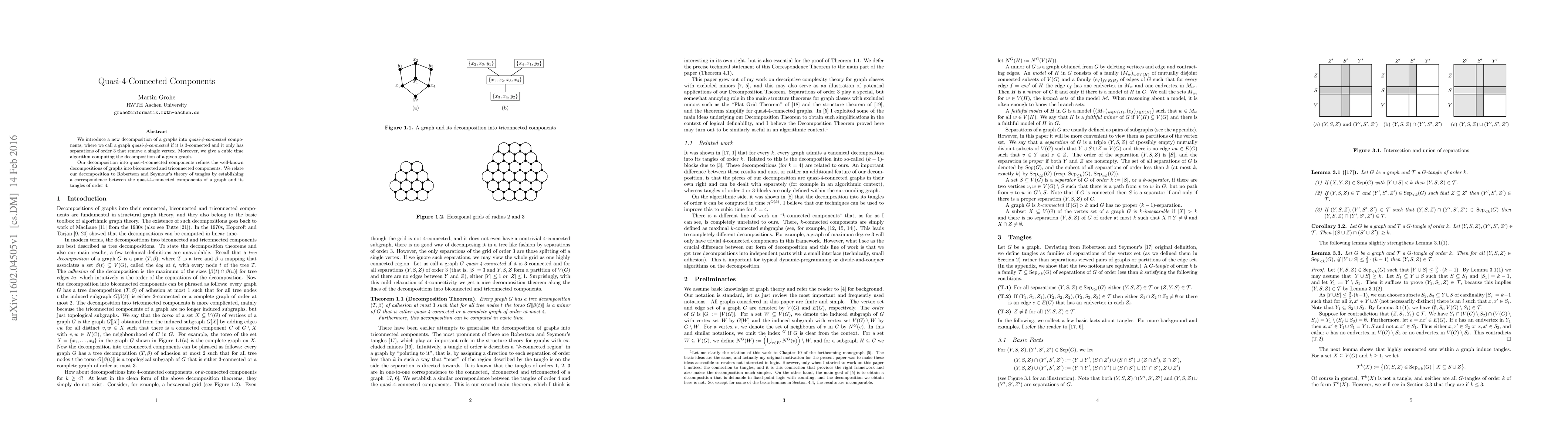 This paper introduces a new graph decomposition into quasi-4-connected components, refining biconnected and triconnected decompositions, and presents a cubic time algorithm to compute this decomposition. It also correlates quasi-4-connected components with Robertson and Seymour's tangles of order 4.